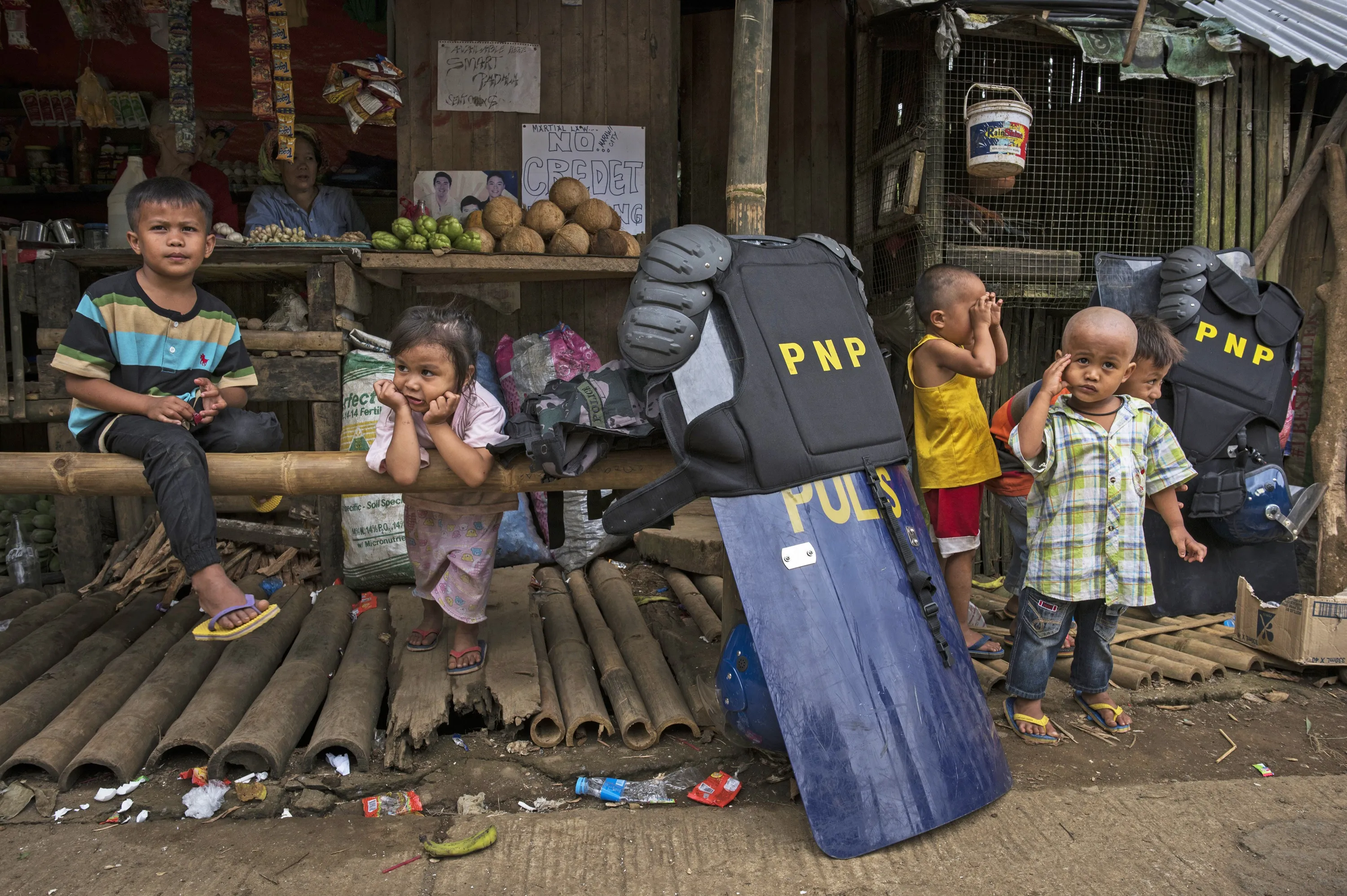 Police gear and shields are placed near playing displaced Marawi children on July 24, in Saguiaran, Lanao del Sur, southern Philippines. Evacuees report of worsening conditions inside evacuation centers, as well as their dificulty adjusting to cultural differences. They call on the government to end martial rule and the bombing of Marawi and let their traditional leaders and ways handle the thwarting of militants from their city. The Philippine Congress voted on Saturday to extend martial law in the southern part of the country since it was imposed to crush a rebellion by Islamic State-inspired militants. The decision was made two days before President Rodrigo Duterte delivers his annual state of the nation address as analysts have reportedly said Mr. Duterte appears to be using the crisis in Marawi as an excuse to impose authoritarian rule in the Philippines. (Photo by Jes Aznar/Getty Images)