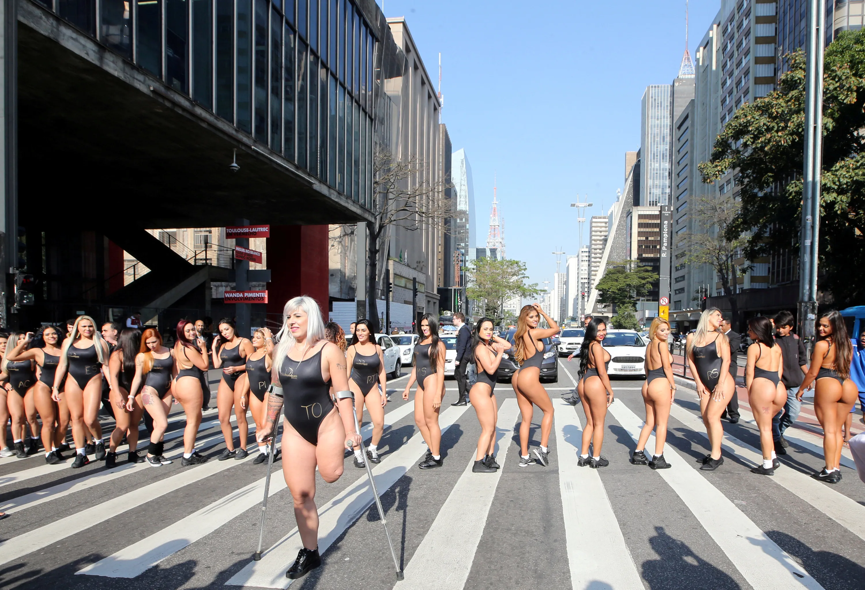 Miss BumBum Brazil 2017 pageant contestants pose at Paulista Avenue in Sao Paulo's financial centre, Brazil, August 7, 2017. (Photo by Paulo Whitaker/Reuters)
