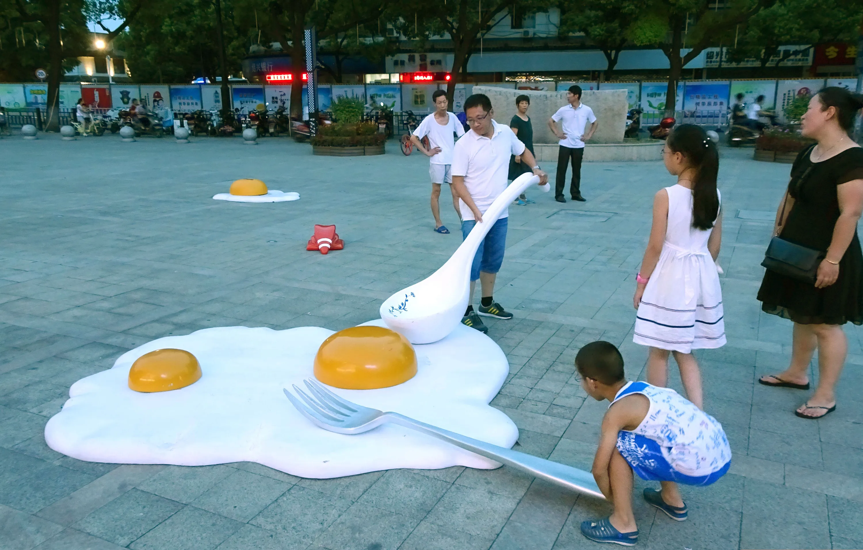 Sunny side up: parents and their children play with giant artworks in the shape of fried eggs, in front of a shopping mall in Shaoxing city, China on August 7, 2017. (Photo by Imaginechina/Rex Features/Shutterstock)