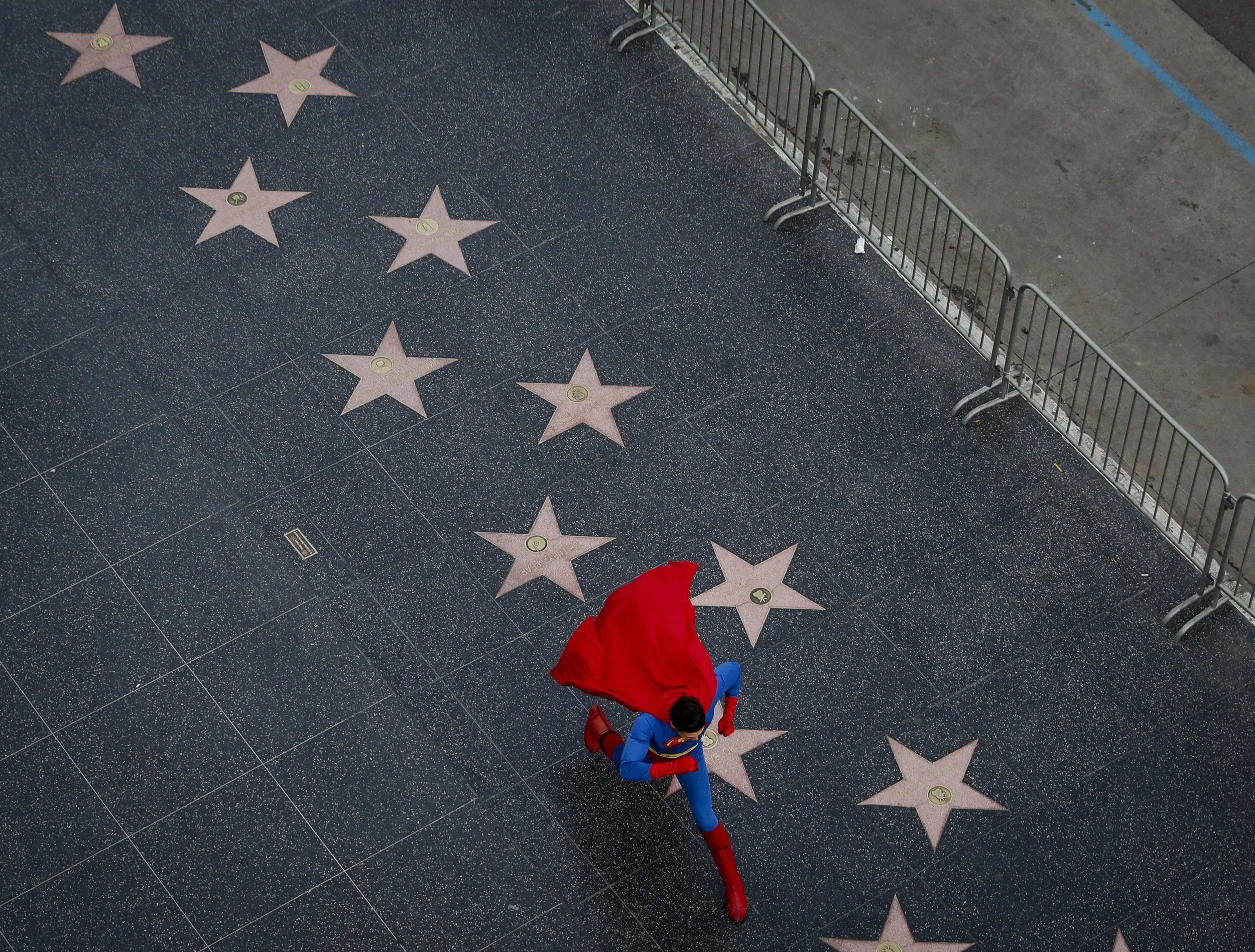 In this Thursday, March 2, 2017 photo, wearing a Superman costume, Toly Shtapenko, of Ukraine, takes a long stride along the Hollywood Walk of Fame to impress tourists, in the Hollywood section of Los Angeles. While the Hollywood we see in movies is a place of glamour and beautiful celebrities, the cast of superheroes filling Hollywood Boulevard is frequently anything but. Many are people struggling to make a buck as they pursue their dream of stardom. (Photo by Jae C. Hong/AP Photo)