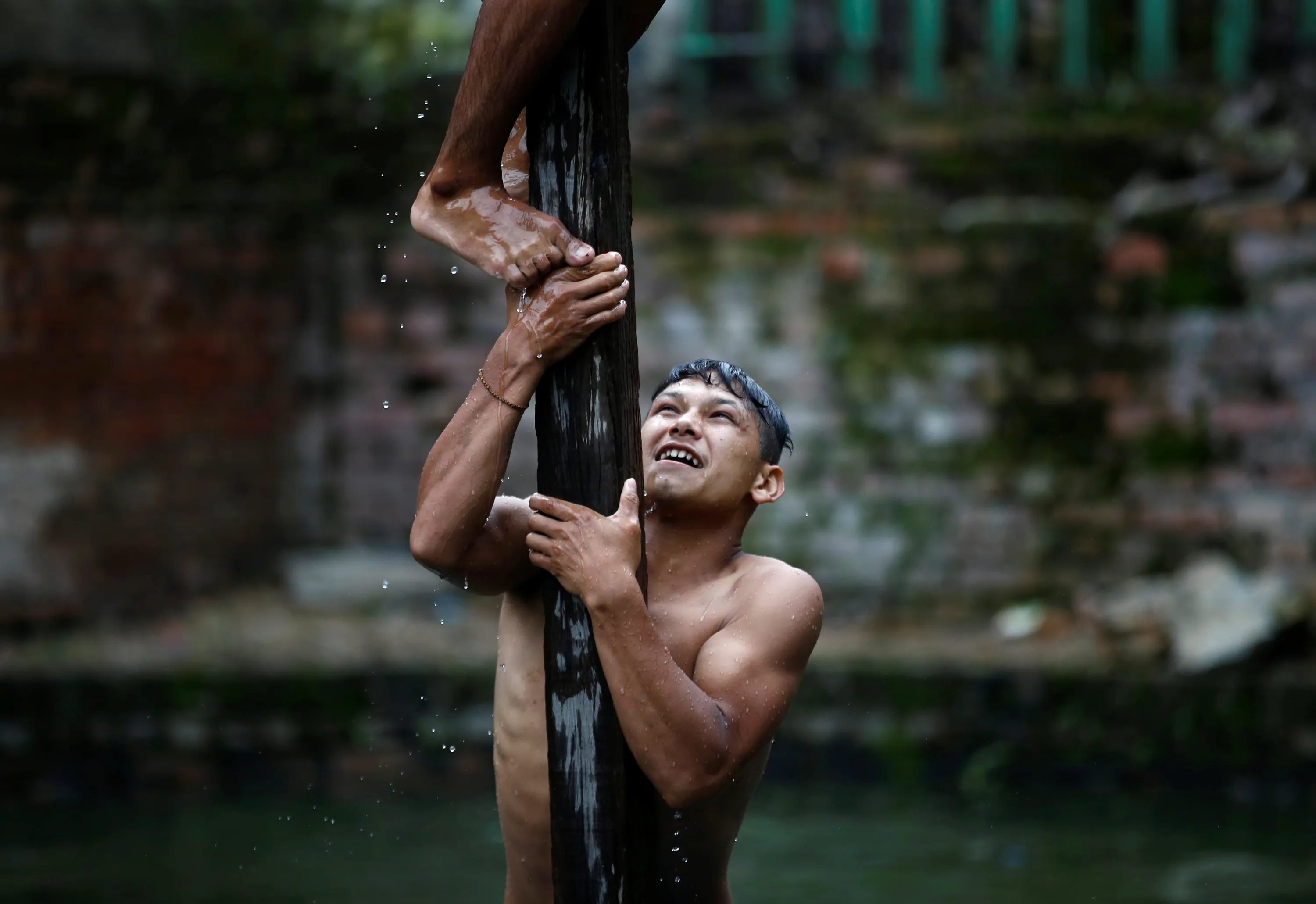 A devotee helps his friend to climb the wooden pole in between the pond while participating in the Deopokhari festival in Khokana, Nepal August 9, 2017. During the annual festival, a live goat is thrown into a pond and the team of devotees that retrieves the animal first wins. (Photo by Navesh Chitrakar/Reuters)