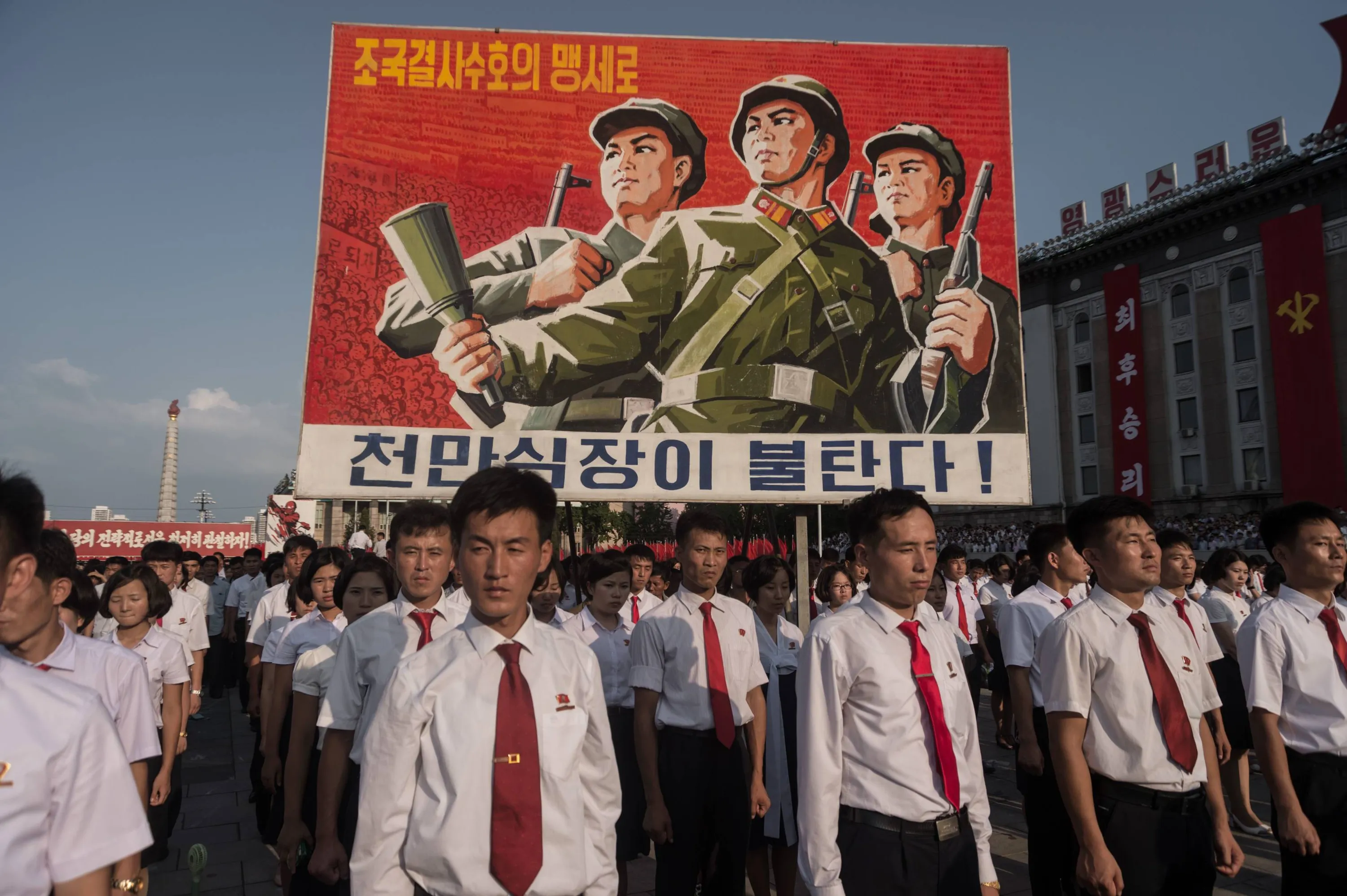 A propaganda poster is diplsyed during a rally in support of North Korea's stance against the US, on Kim Il-Sung square in Pyongyang on August 9, 2017. US President Donald Trump said the United States' nuclear arsenal was “more powerful than ever” in a fresh warning to North Korea over its repeated missile tests. (Photo by Kim Won-Jin/AFP Photo)