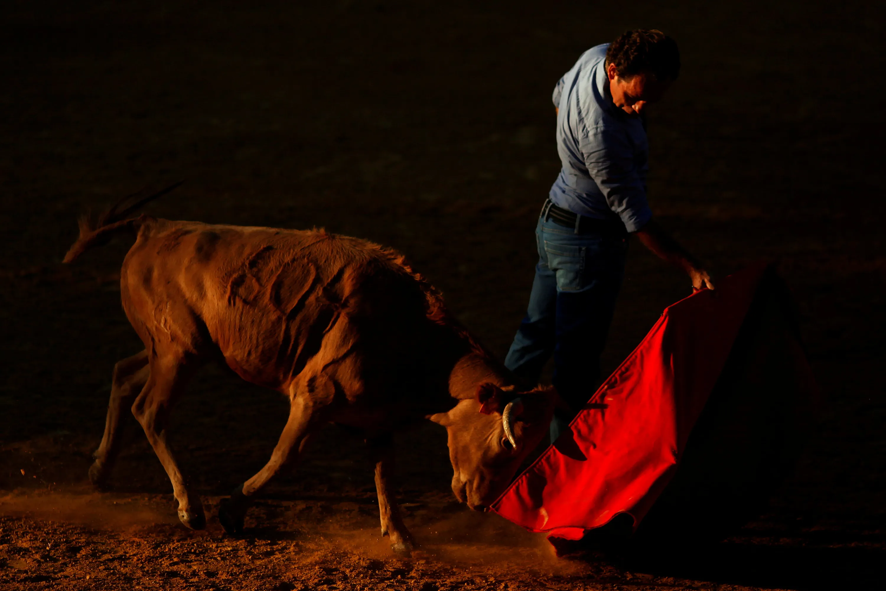 Spanish bullfighter Rafael Tejada performs a pass to a heifer during a “tentadero” (a small bullfight to check the bravery of heifers which are not killed) at Reservatauro Ronda cattle ranch in Ronda, near Malaga, southern Spain August 9, 2017. (Photo by Jon Nazca/Reuters)