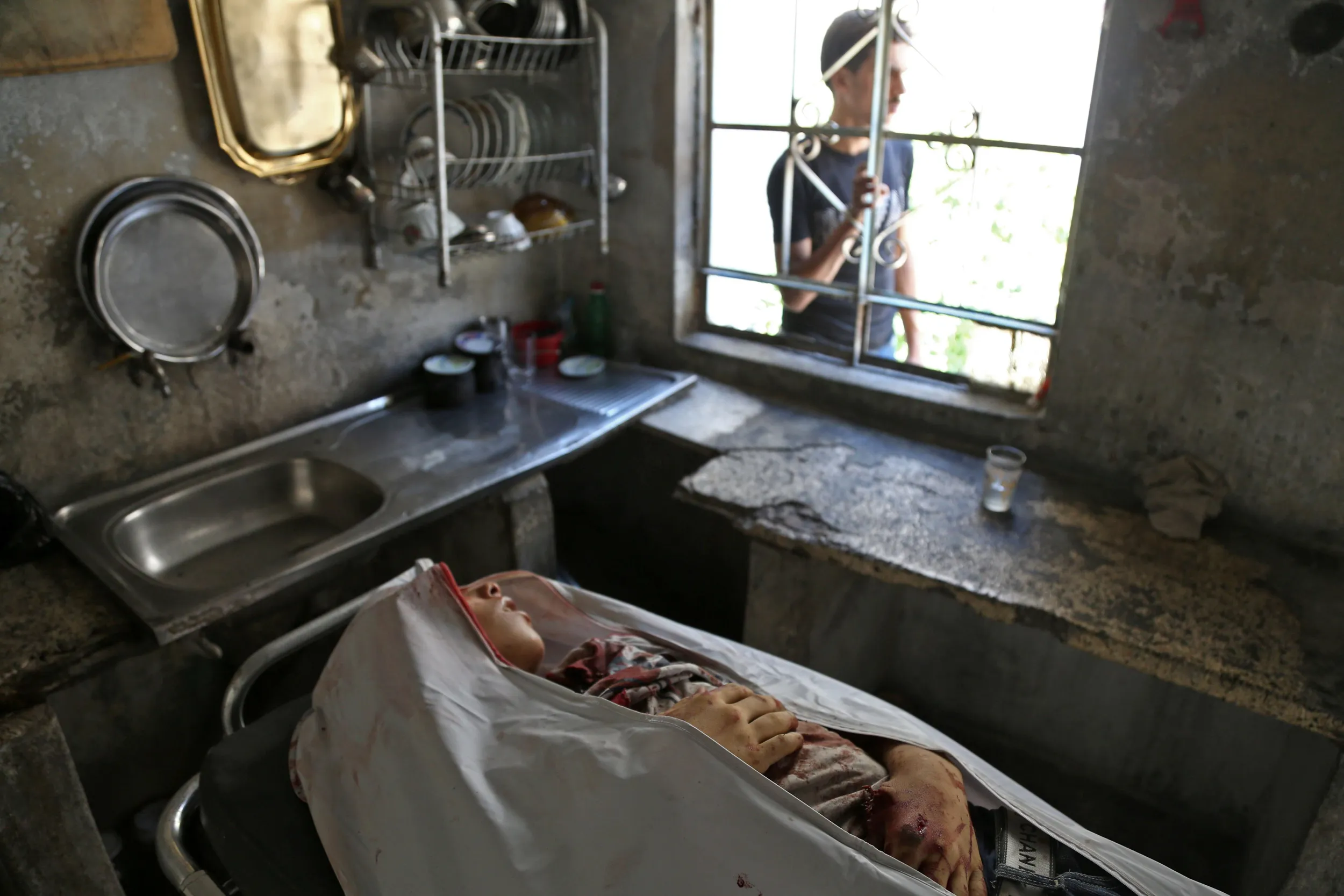 A picture taken on August 10, 2017 shows the body of a Syrian child who was reportedly killed during regime shellings in the rebel-controlled town of Hamouria, in the eastern Ghouta region on the outskirts of the capital Damascus, lying in his home kitchen prior to being prepared for funeral and burial. (Photo by Abdulmonam Eassa/AFP Photo)