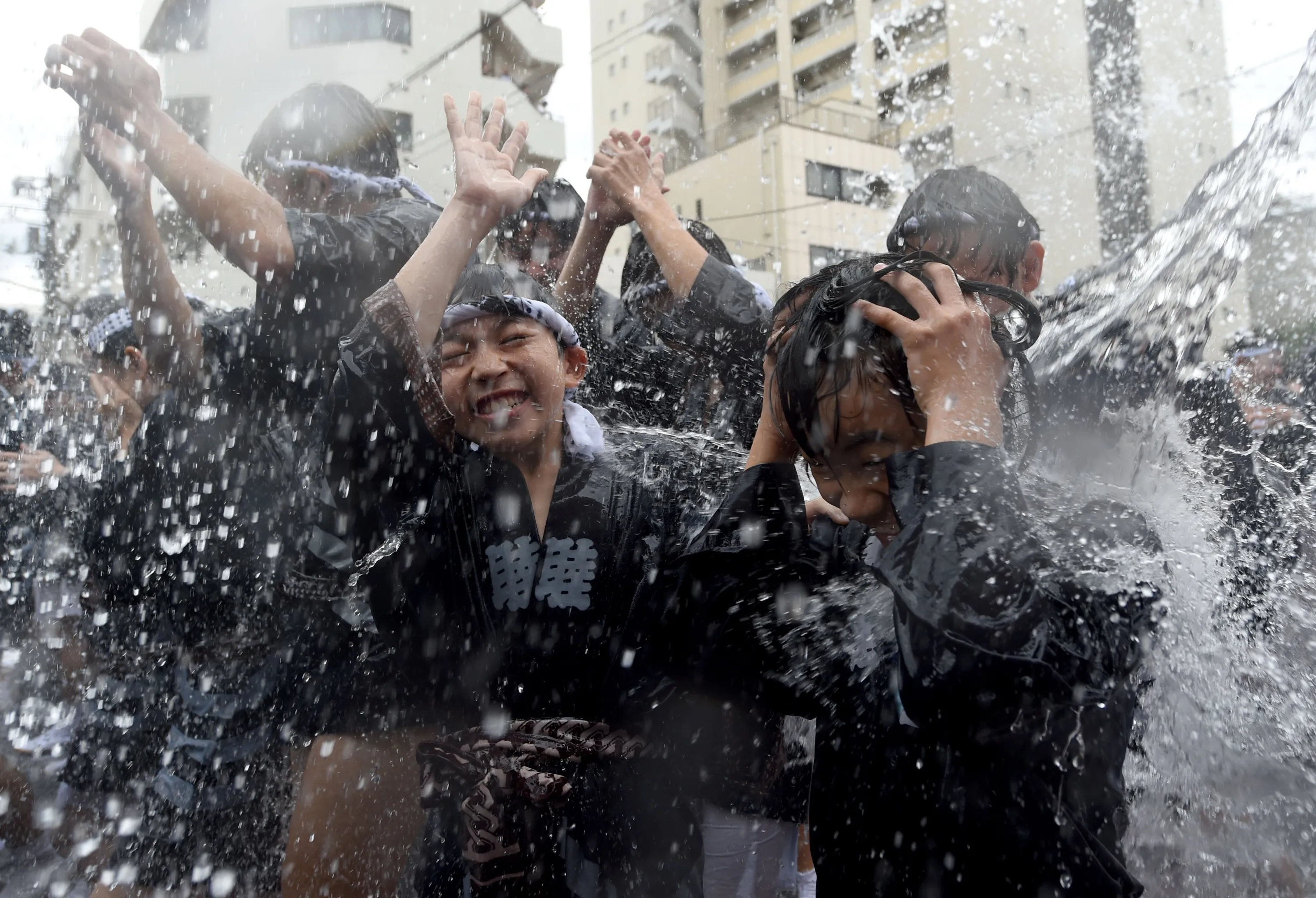 Residents carrying a portable shrine are splashed with water as they take part in the annual Fukagawa Hachimangu Festival in Tokyo on August 13, 2017. Thousands of people attended one of Tokyo' s three big Shinto festivals where many portable shrines are paraded through the streets, with water used to cool down as well as purify participants. (Photo by Toshifumi Kitamura/AFP Photo)