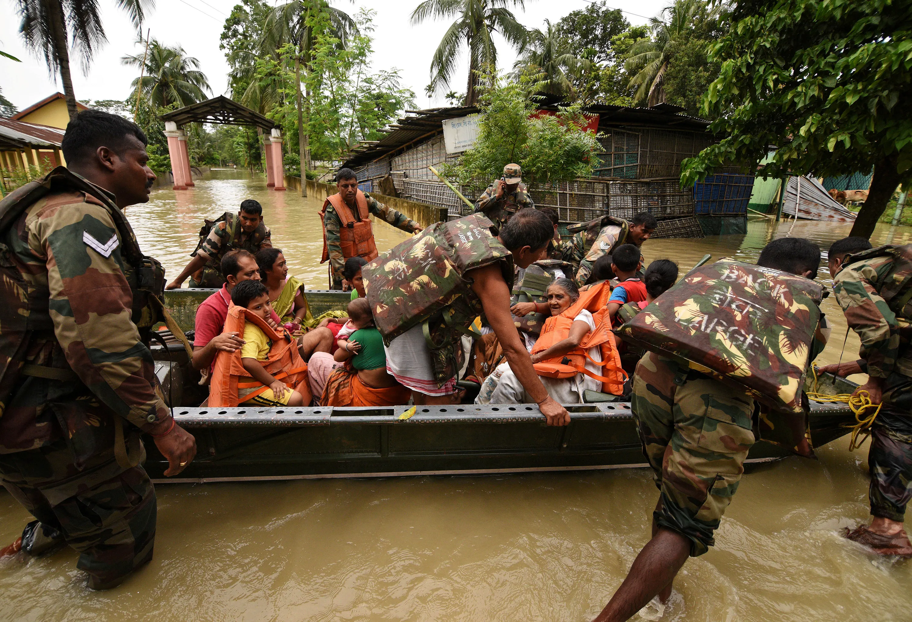 Indian army soldiers evacuate villagers affected by flood in Jakhalabandha area in Nagaon district, in the northeastern state of Assam, India, August 13, 2017. (Photo by Anuwar Hazarika/Reuters)