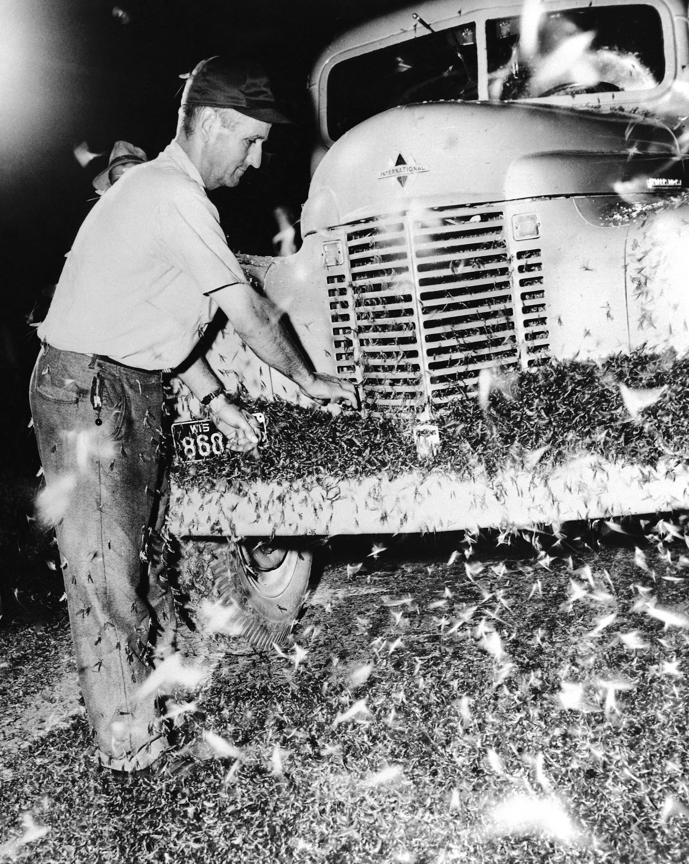 Lawrence Rutz stops his truck on the West Channel Bridge at LaCrosse, Wisconsin, July 8, 1946, to clear May flies from the front of his vehicle. Mayflies became so thick, they obstructed motorist's view, clogged radiators, and made roadway of bridge slippery. (Photo by AP Photo)
