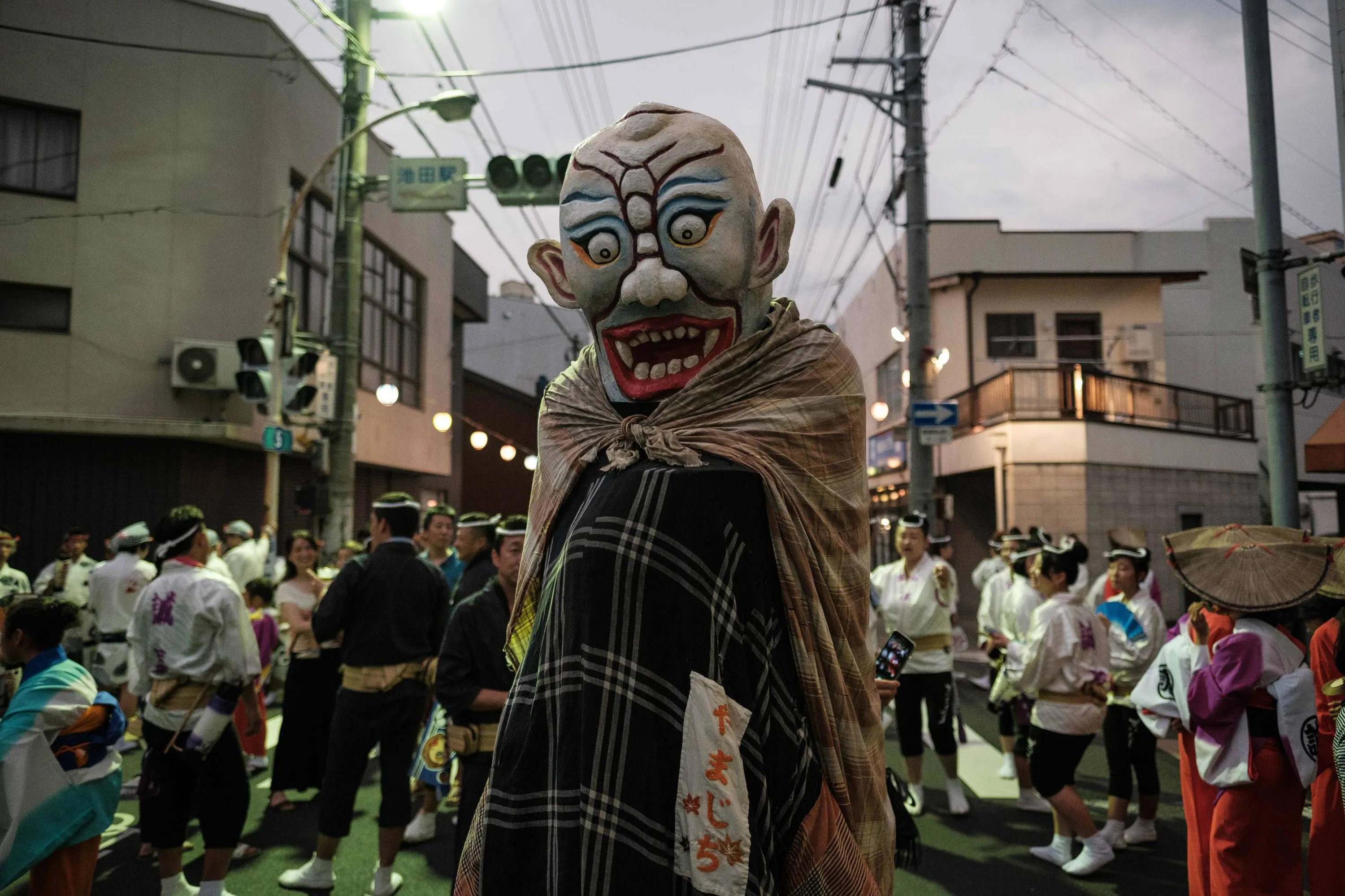 This photo taken on August 16, 2017 shows a dancer disguised as an imaginary monster in Japanese folklore walking on a street at the Ikeda Awa Odori Festival in the city of Miyoshi, about 80 kms west of Tokushima, Tokushima prefecture, on Japan's Shikoku island. Various places in Tokushima prefecture hold the annual Awa Odori festival during “obon”, an annual Buddhist period in August to welcome ancestors' souls which are believed to return to this world and visit their families. (Photo by Yasuyoshi Chiba/AFP Photo)