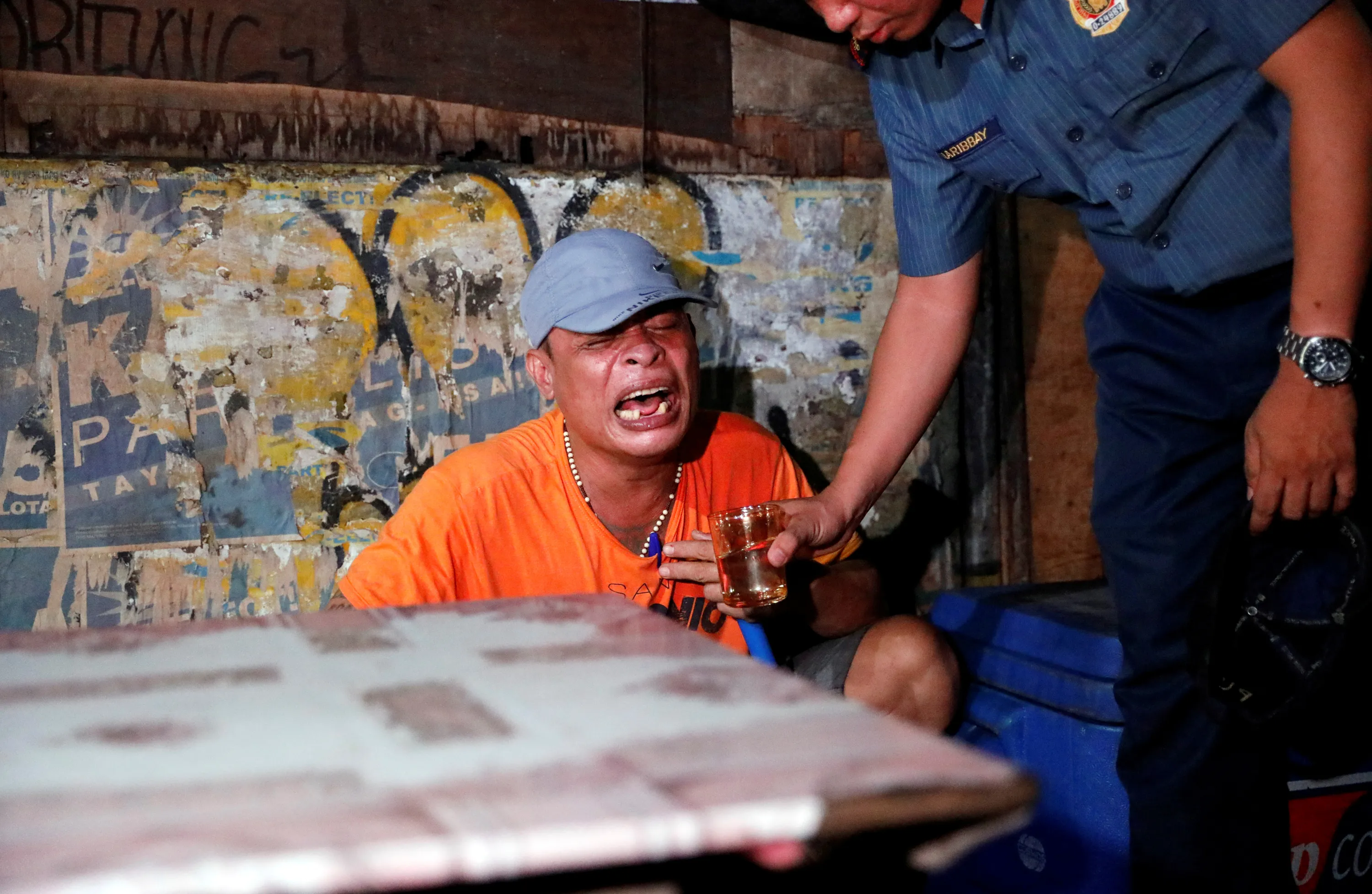 A police officer gives a glass of water to a man as he comforts him after his brother, who police say was killed in a spate of drug-related violence overnight, was shot in Manila, Philippines on August 17, 2017. (Photo by Dondi Tawatao/Reuters)