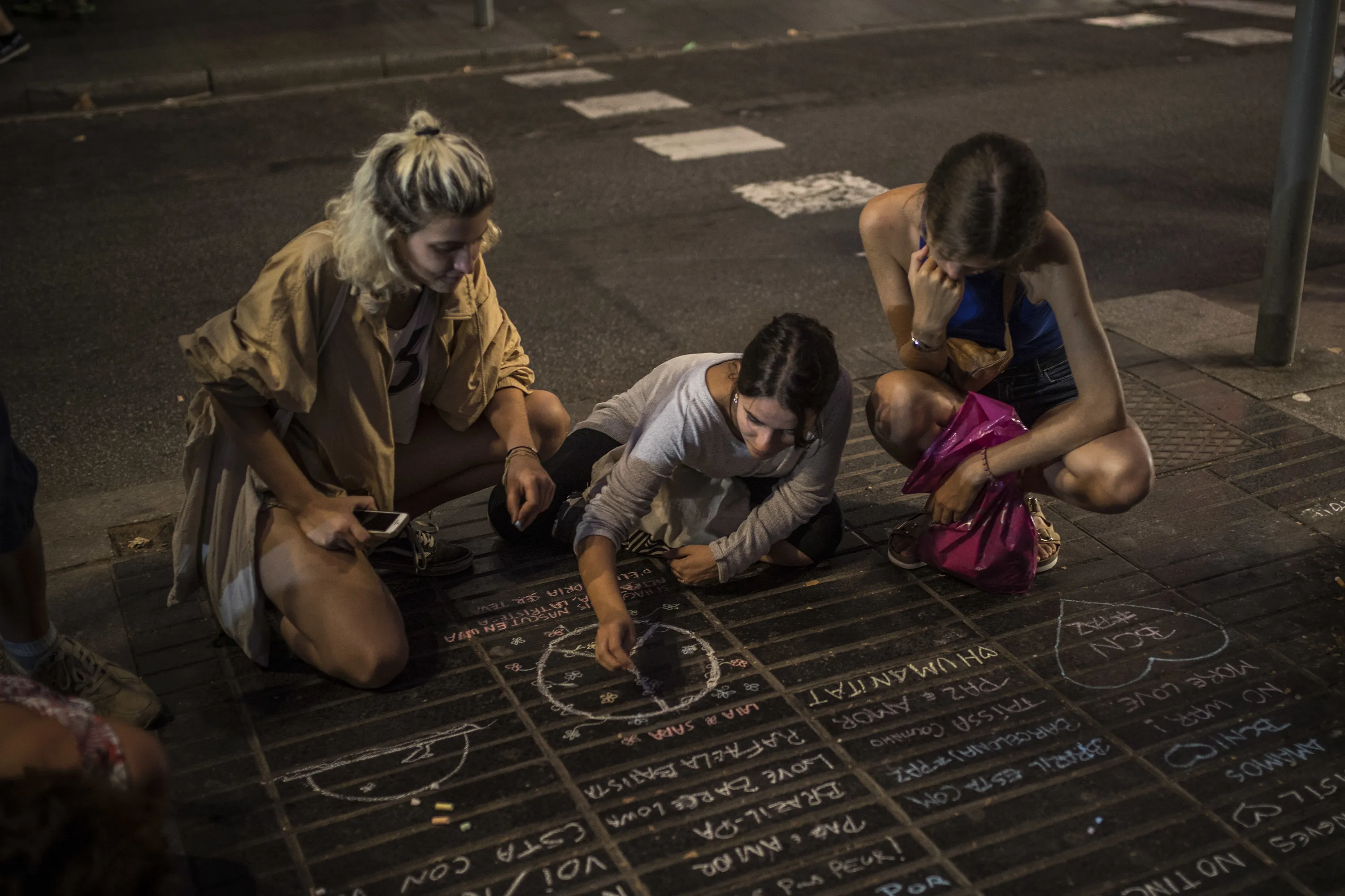A girl draws a peace symbol on the street as a tribute to the victims of the terrorist attack, on the historic street of Las Ramblas, two day after the vehicle attacks, in Barcelona, Spain, Friday August 18, 2017. Authorities in Spain and France pressed the search Saturday for the supposed ringleader of an Islamic extremist cell that carried out vehicle attacks in Barcelona and a seaside resort, as the investigation focused on links among the Moroccan members and the house where they plotted the carnage. (Photo by Santi Palacios/AP Photo)