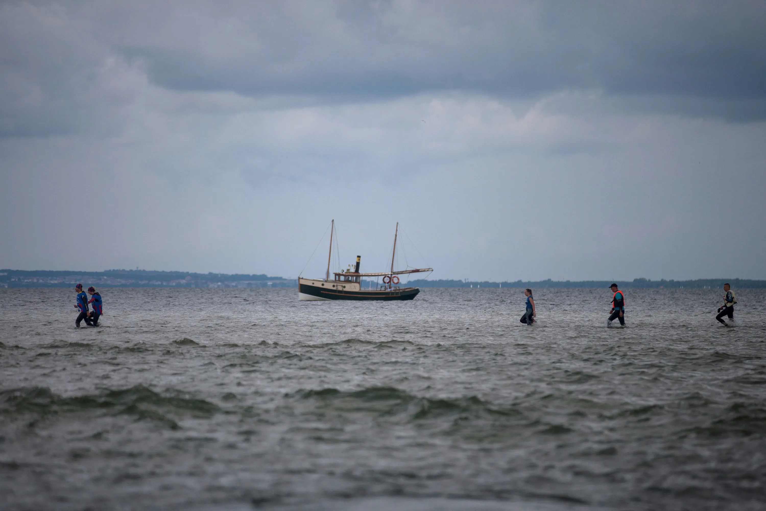 People walk through Puck Bay during the Herring March with a yacht in the background, in Kuznica, Poland August 19, 2017. (Photo by Jekaterina Saveljeva/Reuters)