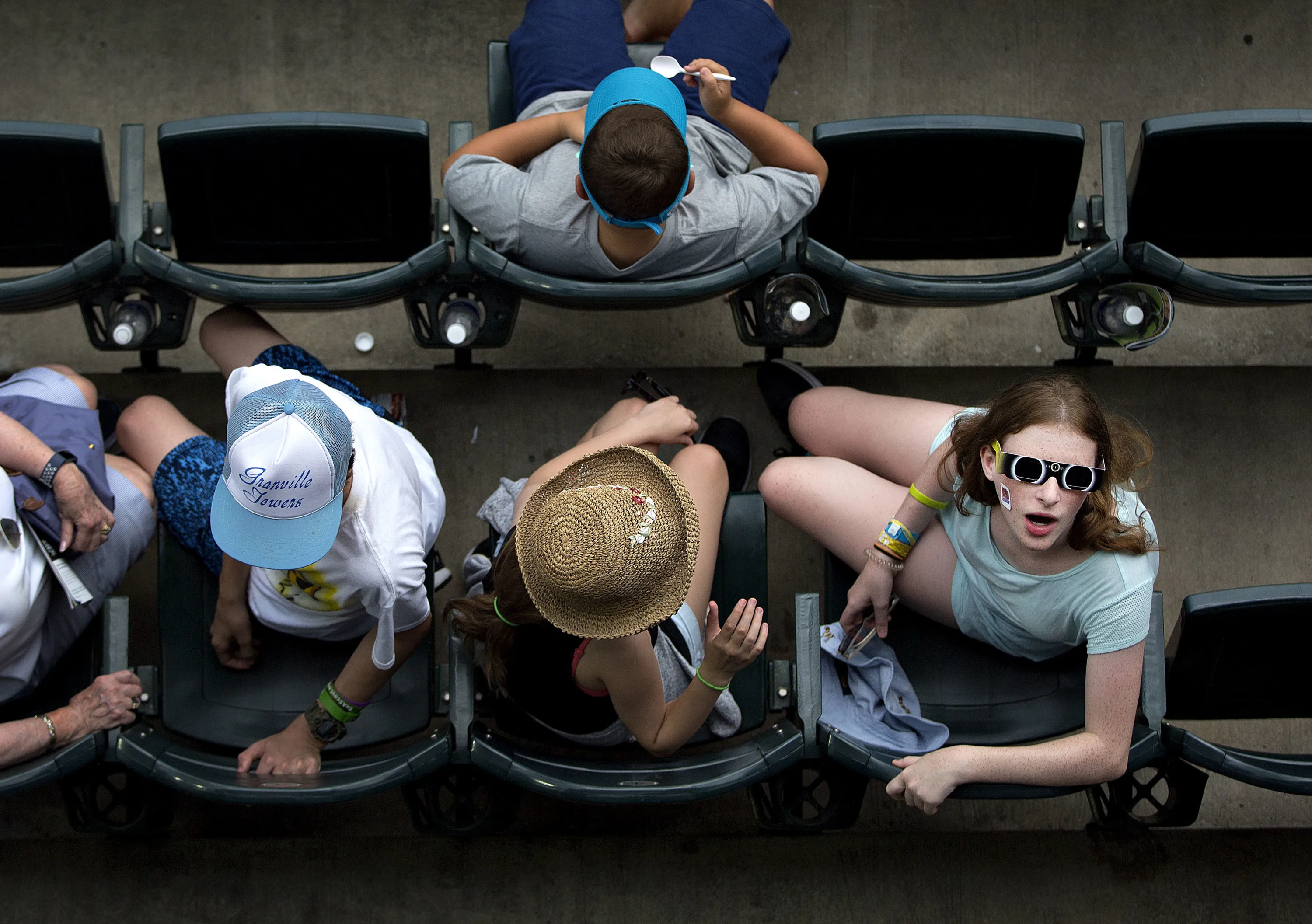 Yael Ziv, of Baltimore, searches the cloudy skies for a sign of the eclipse during a baseball game at First National Bank Field, Monday, August 21, 2017, in Greensboro, N.C. (Photo by Andrew Krech/News & Record via AP Photo)