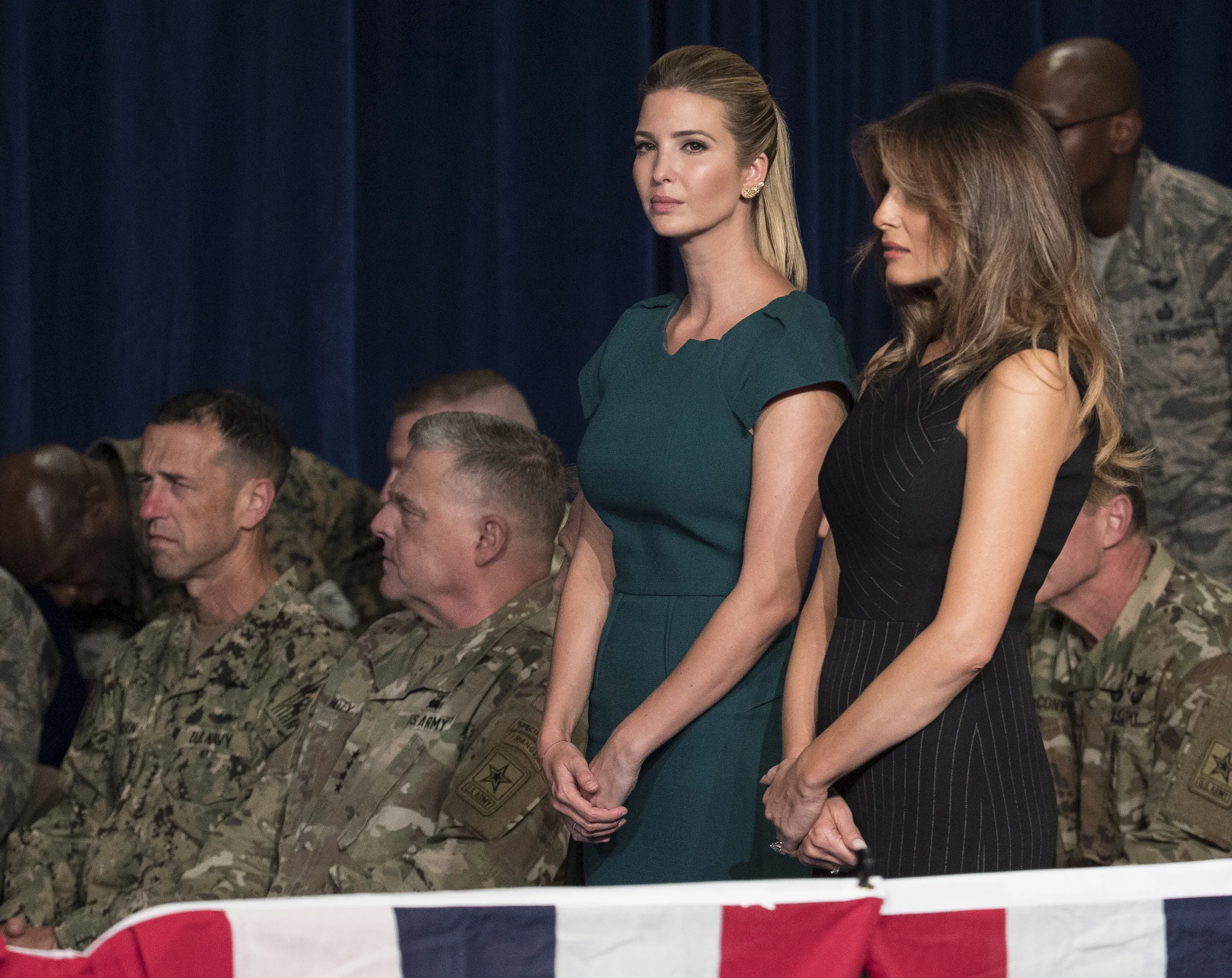 Ivanka Trump, the daughter of President Donald Trump, and first lady Melania Trump stand together before President Donald Trump arrives to speak at Fort Myer in Arlington Va., Monday, August 21, 2017, during a Presidential Address to the Nation about a strategy he believes will best position the U.S. to eventually declare victory in Afghanistan. (Photo by Carolyn Kaster/AP Photo)