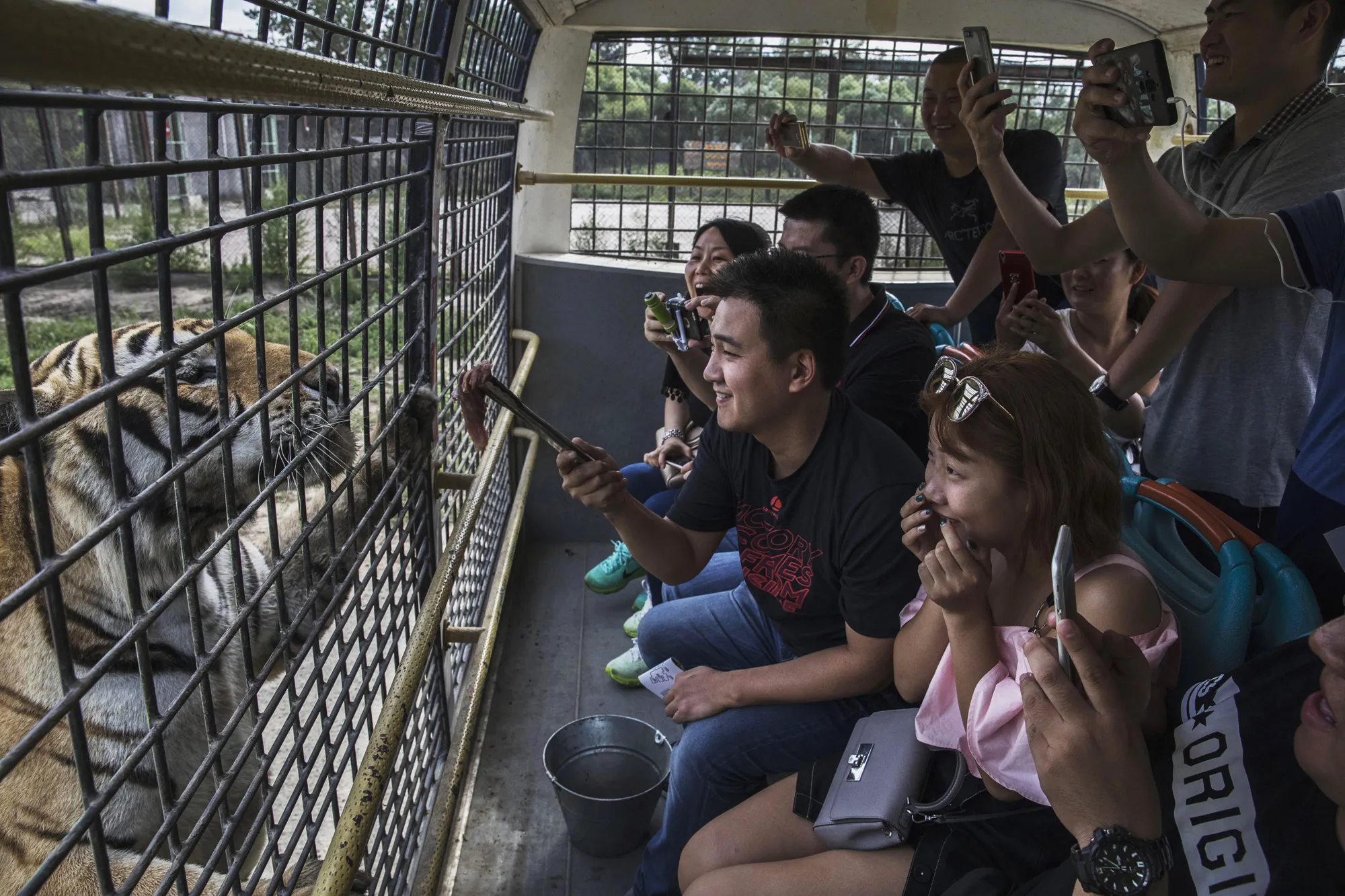 A Chinese tourist dangles a piece of raw meat in front of a Siberian tiger as they ride in a bus at the Heilongjiang Siberian Tiger Park on August 16, 2017 in Harbin, northern China. (Photo by Kevin Frayer/Getty Images)