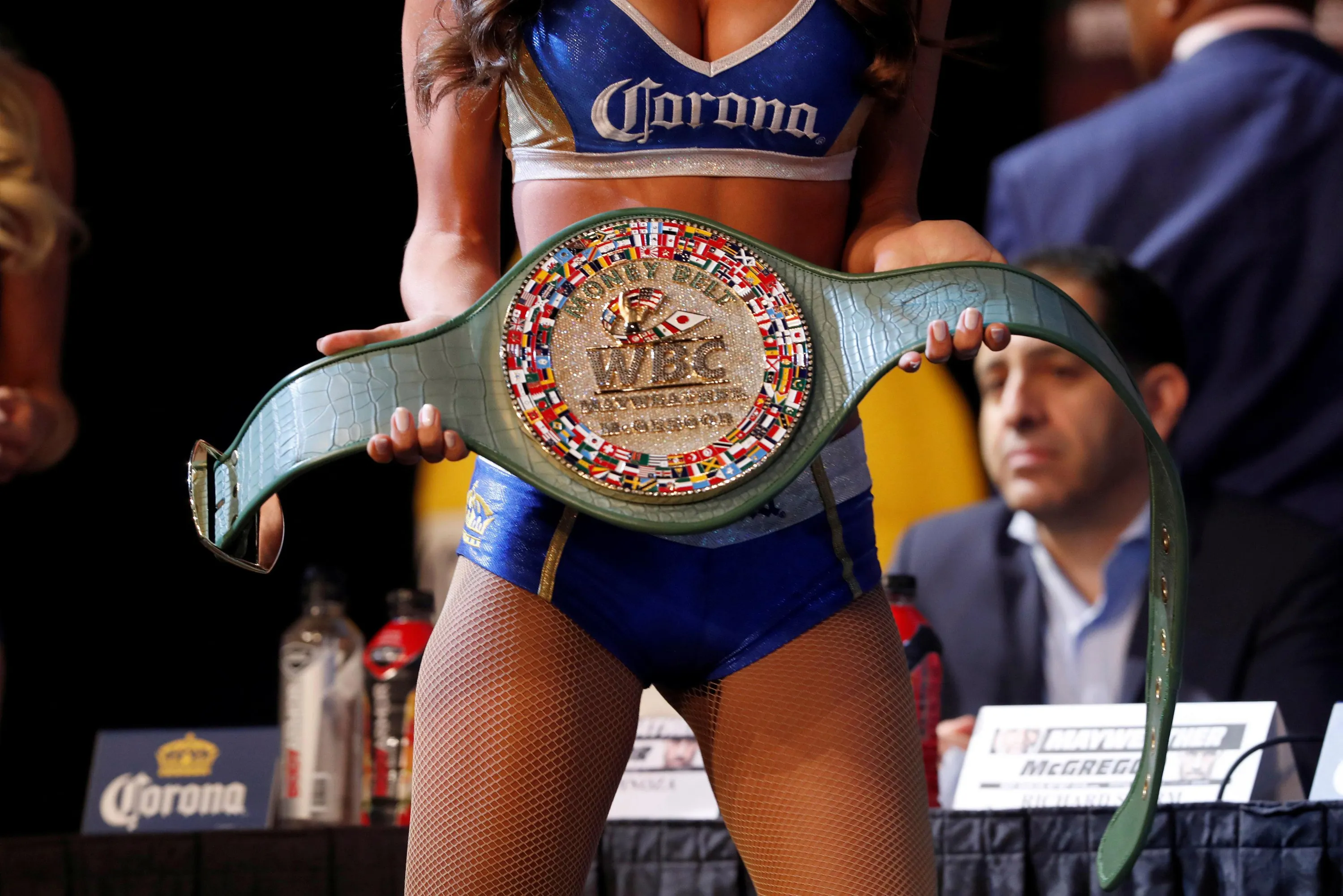 The victor' s belt is displayed during a press conference with boxer Floyd Mayweather Jr. and MMA figher Connor Mcgregor on August 23, 2017 at the MGM Grand in Las Vegas, Nevada. .Mayweather, the 40- year- old undefeated former welterweight boxing champion, has been lured out of retirement to face McGregor, a star of mixed martial arts' Ultimate Fighting Championship. The two men meet in a 12- round contest under boxing rules on August 26 th that is tipped to become the richest fight in history. (Photo by Steve Marcus/Reuters/Las Vegas Sun)