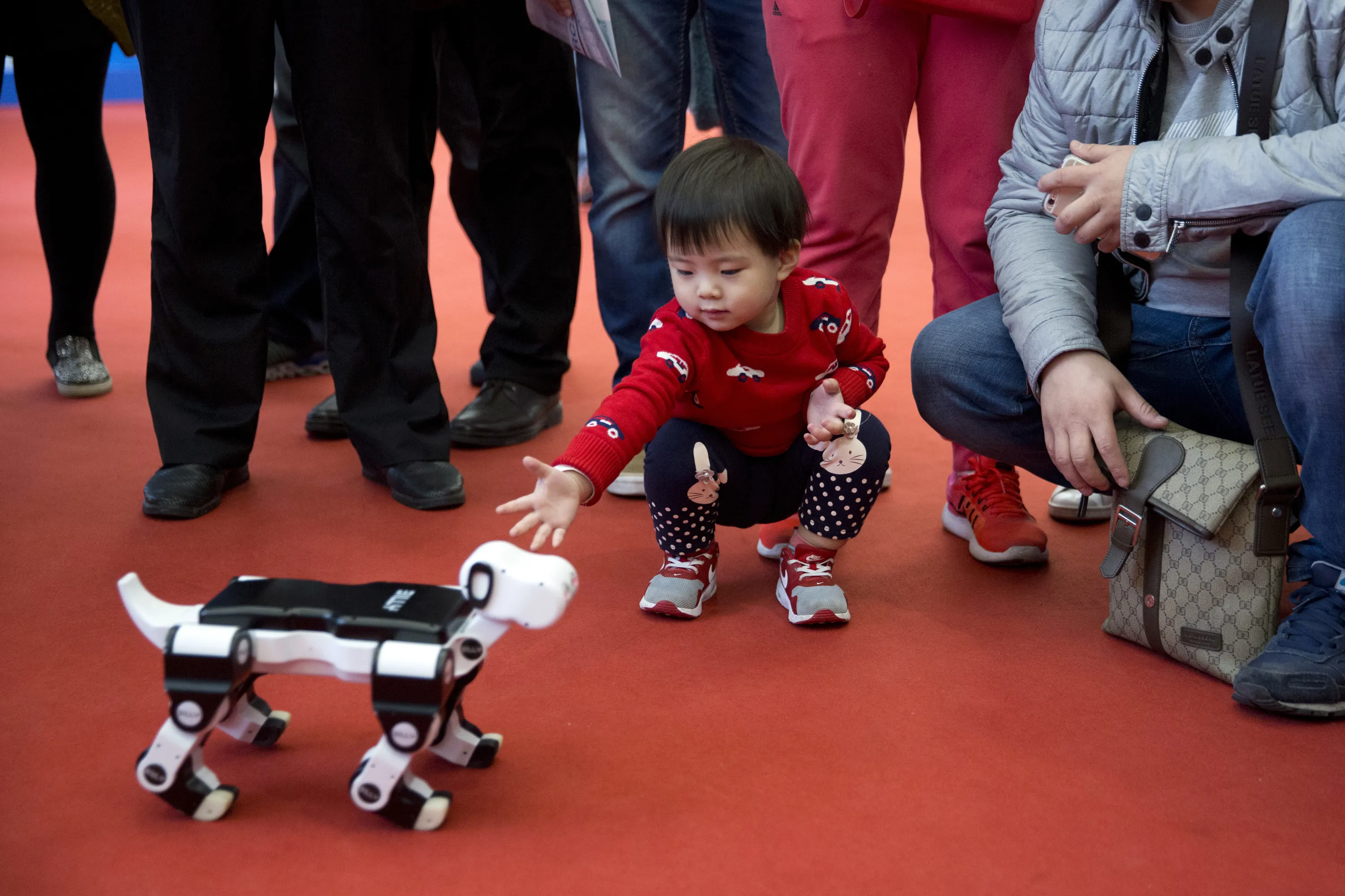 A child reaches out to a robotic dog displayed at the World Robot Conference in Beijing, China, Friday, October 21, 2016. The conference showcased China's burgeoning robot industry as the nation seeks to increase the use of robots in its manufacturing and service industries. (Photo by Ng Han Guan/AP Photo)