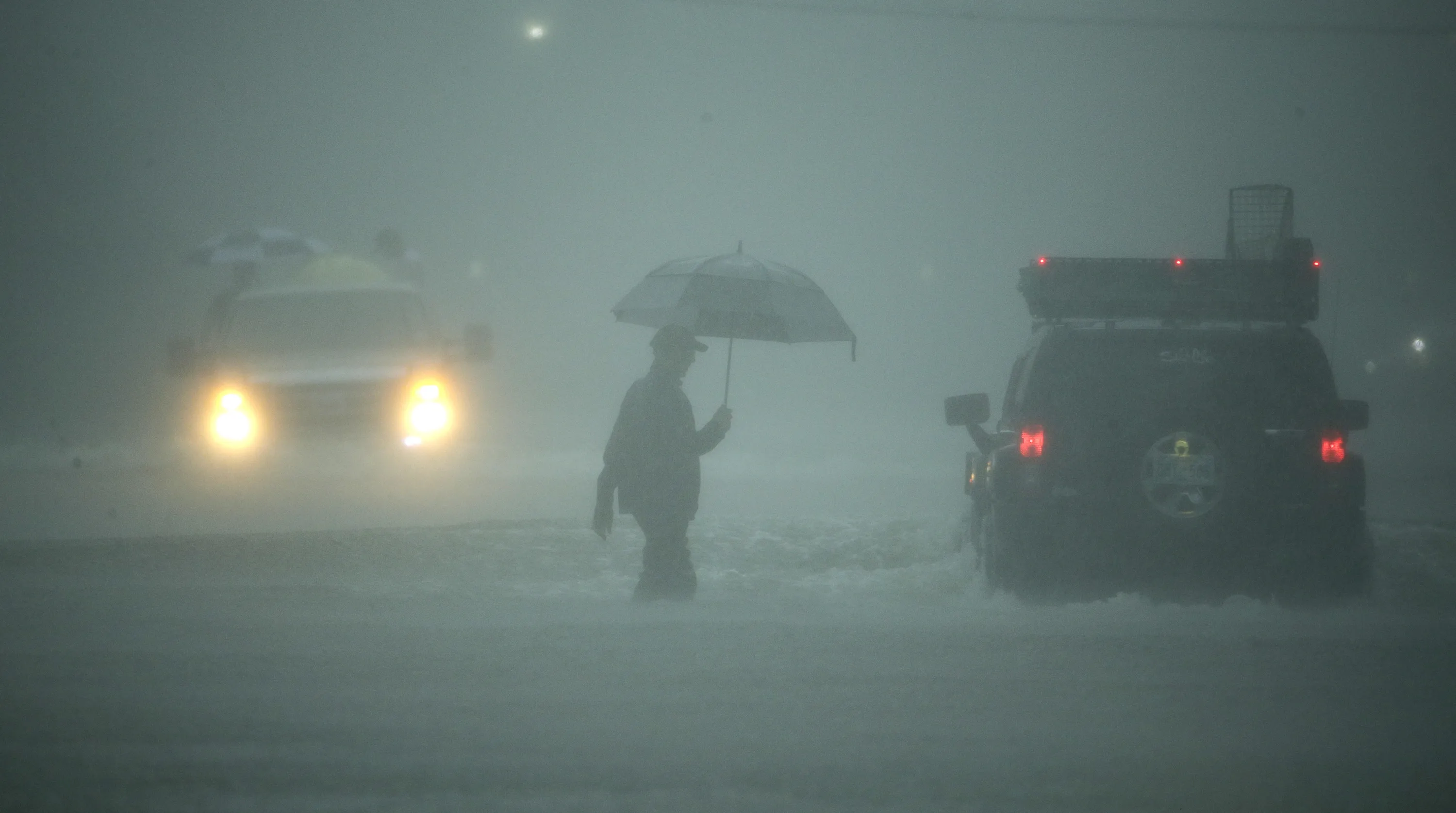 A man walks through floodwaters from Tropical Storm Harvey as he evacuates his home on Sunday, August 27, 2017, in Houston, Texas. (Photo by Charlie Riedel/AP Photo)