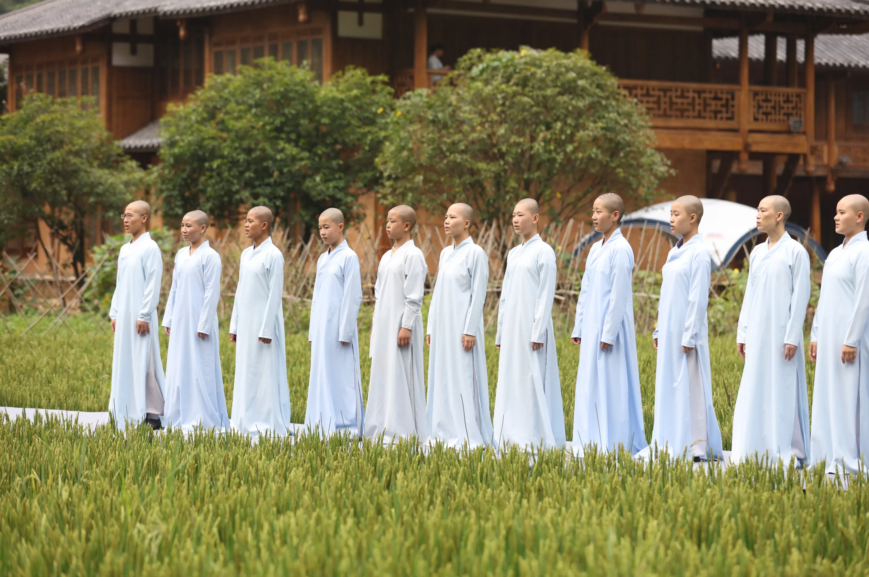 China's first monks chorus, “Dawn” chorus from Tiantai Temple Conservatory of Buddhist Music, perform on the roof of a music hall at the 2017 Huanglong Music Festival and International Chorus Week on August 21, 2017 in Zhangjiajie, Hunan Province of China. 112 teams will compete in the 2017 Huanglong Music Festival and International Chorus Week held in Zhangjiajie. (Photo by VCG/VCG via Getty Images)