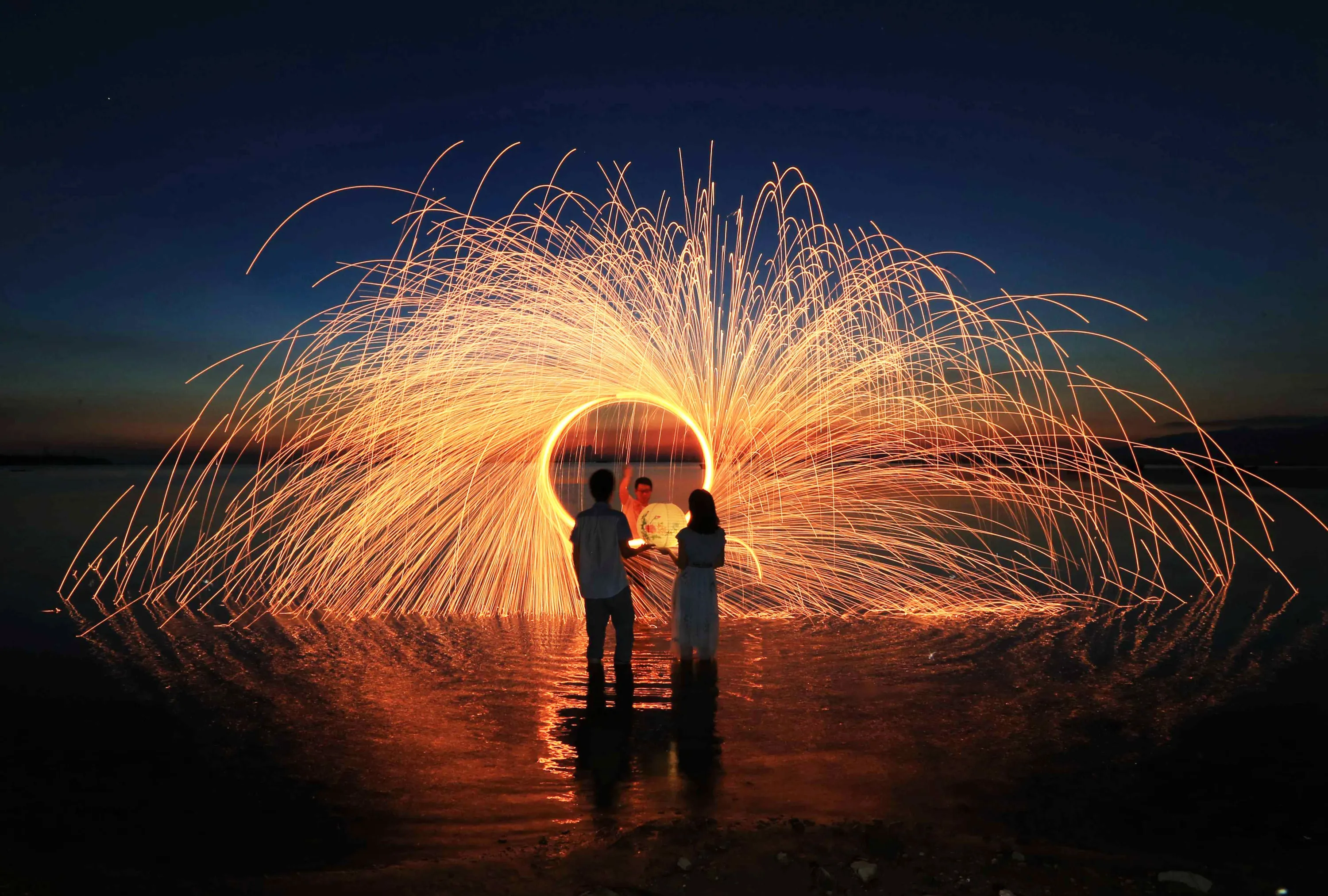 A couple watches fireworks performance on Poyang Lake during Qixi Festival on August 28, 2017 in Jiujiang, Jiangxi Province of China. The performer draws a circle with fireworks on Poyang Lake to celebrate Chinese Valentines's Day. (Photo by VCG/VCG via Getty Images)