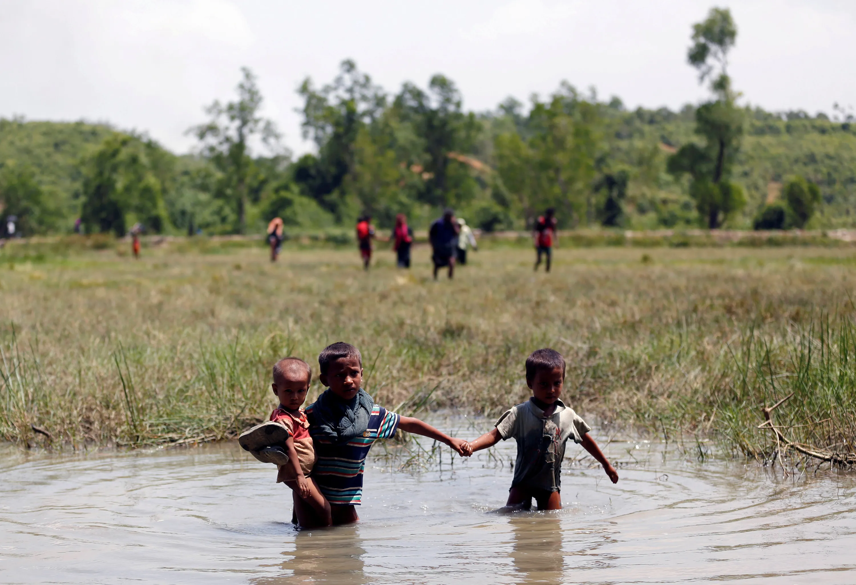 Rohingya children make their way through water as they try to come to the Bangladesh side from No Man’s Land after a gunshot being heard on the Myanmar side, in Cox’s Bazar, Bangladesh August 28, 2017. (Photo by Mohammad Ponir Hossain/Reuters)