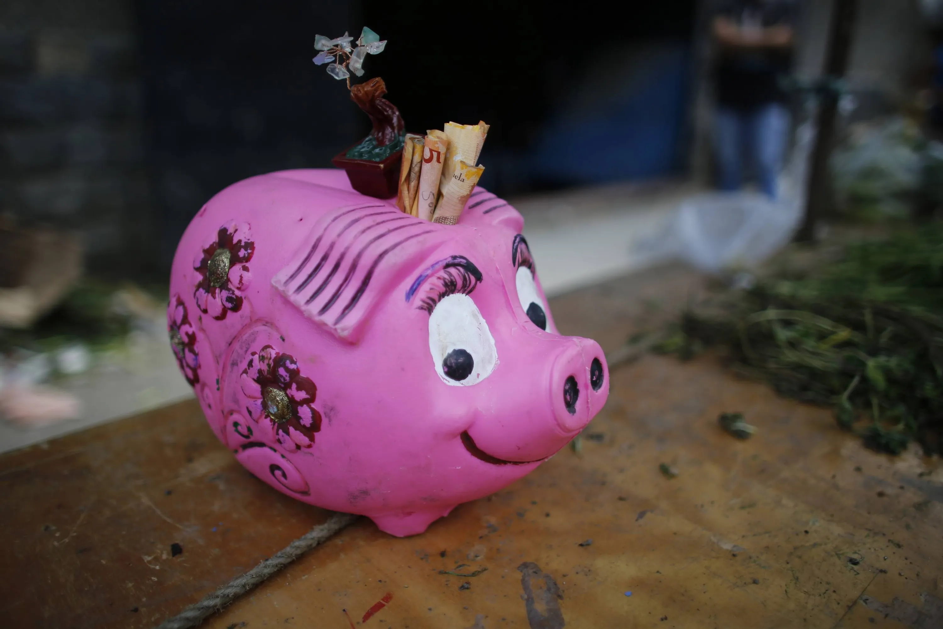 In this August 23, 2017 photo, a piggy bank for tips, filled with 5 Bolivar bills, sits on the table of a vegetable vendor at a market in Caracas, Venezuela. Since 2014, the economy has shrunk by 35 percent, more than the U.S. did during the Great Depression. (Photo by Ariana Cubillos/AP Photo)