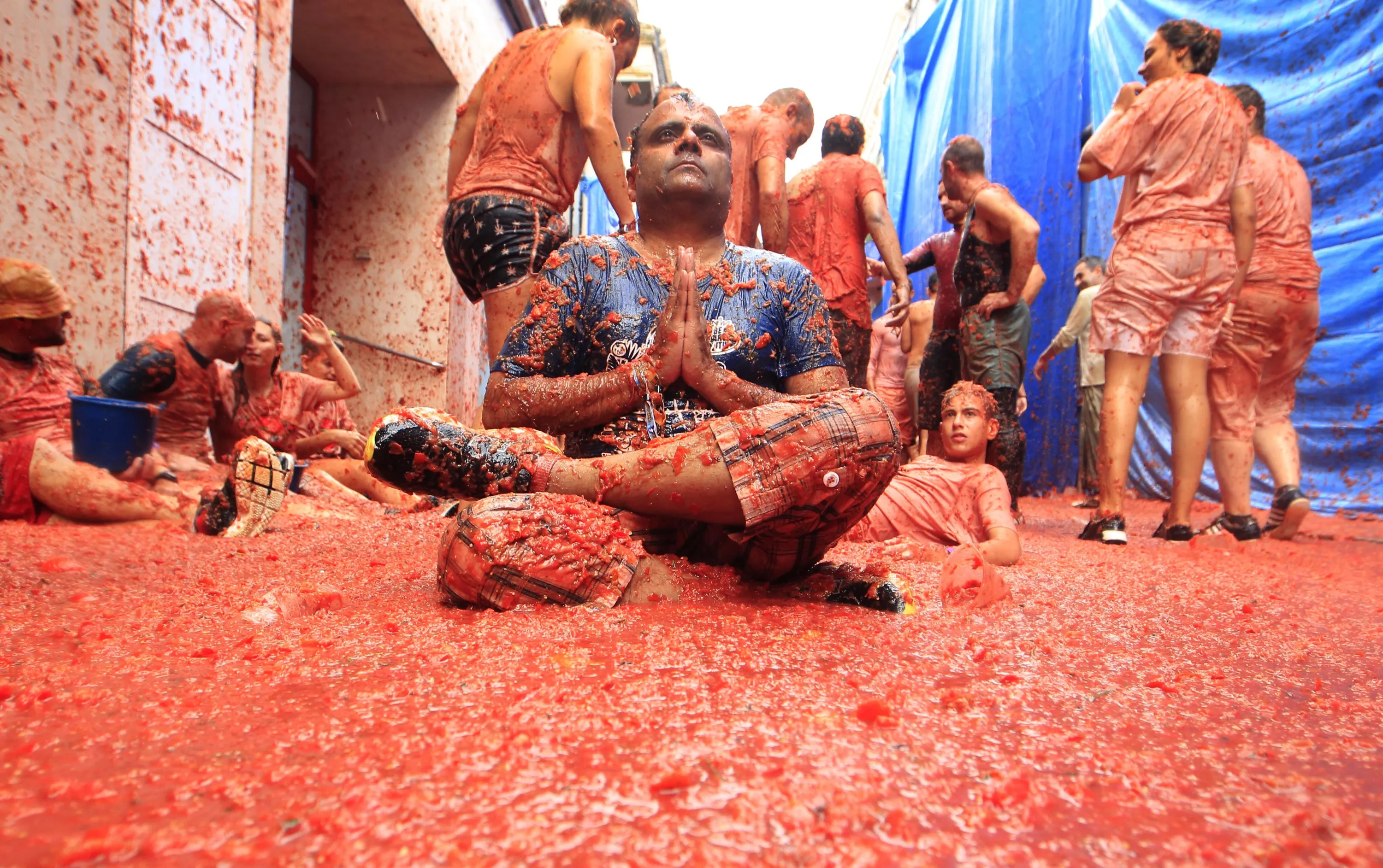 A reveler poses as others enjoy throwing tomatoes at each other, during the annual “Tomatina”, tomato fight fiesta, in the village of Bunol, 50 kilometers outside Valencia, Spain, Wednesday, August 30, 2017. (Photo by Alberto Saiz/AP Photo)