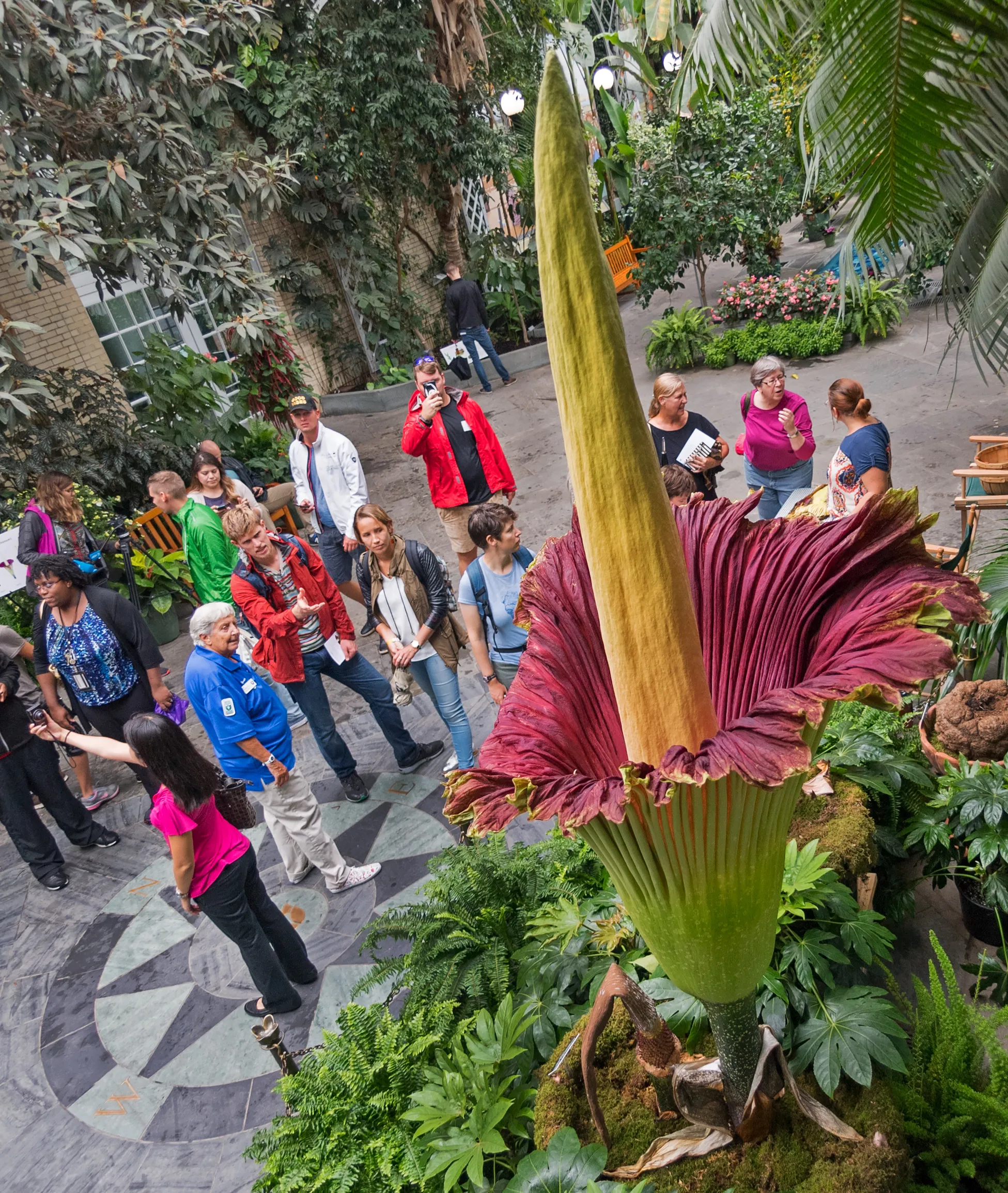 Visitors look at a blooming Corpse Flower (Titan Arum) that grew to 99.5 inches (252.7 cm) at the US Botanical Garden on August 29, 2017, in Washington, DC. The giant flower is known for its rotting meat odor and short life of 24-48 hours before it collapses. (Photo by Paul J. Richards/AFP Photo)