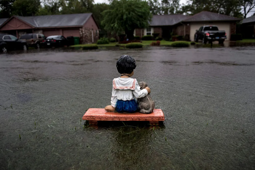A lawn ornament is seen on a flooded street during the aftermath of Hurricane Harvey August 29, 2017 in Houston, Texas. Harvey has set what forecasters believe is a new rainfall record for the continental US, officials said Tuesday. Harvey, swirling for the past few days off Texas and Louisiana has dumped more than 49 inches (124.5 centimeters) of rain on the region. (Photo by Brendan Smialowski/AFP Photo)