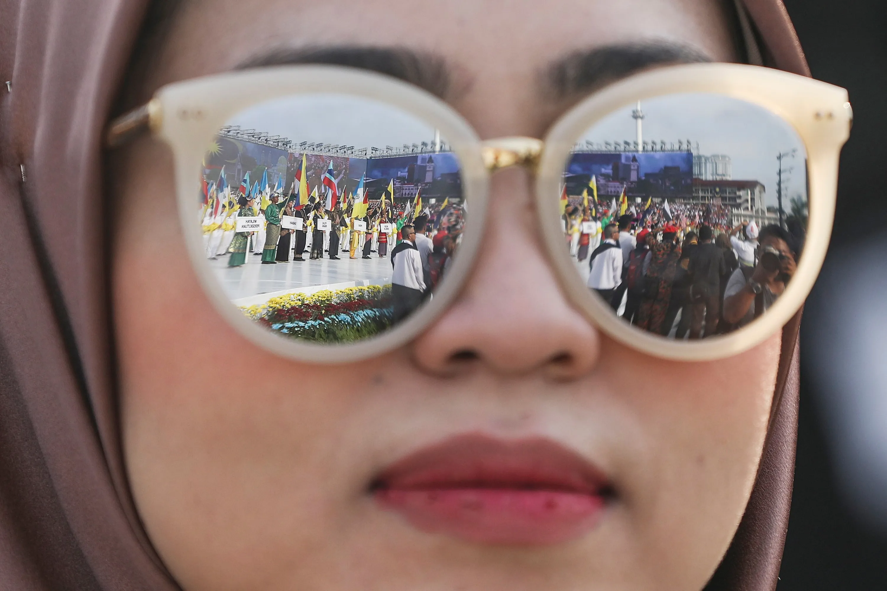 School children performing are reflected in the sunglasses of a woman during Independence Day celebrations in Kuala Lumpur, Malaysia, 31 August 2017. Malaysia, which gained its independence from British colonial rule in 1957, celebrates its 60th Independence Day, officially known as Hari Merdeka, on 31 August. (Photo by Fazry Ismail/EPA/EFE)