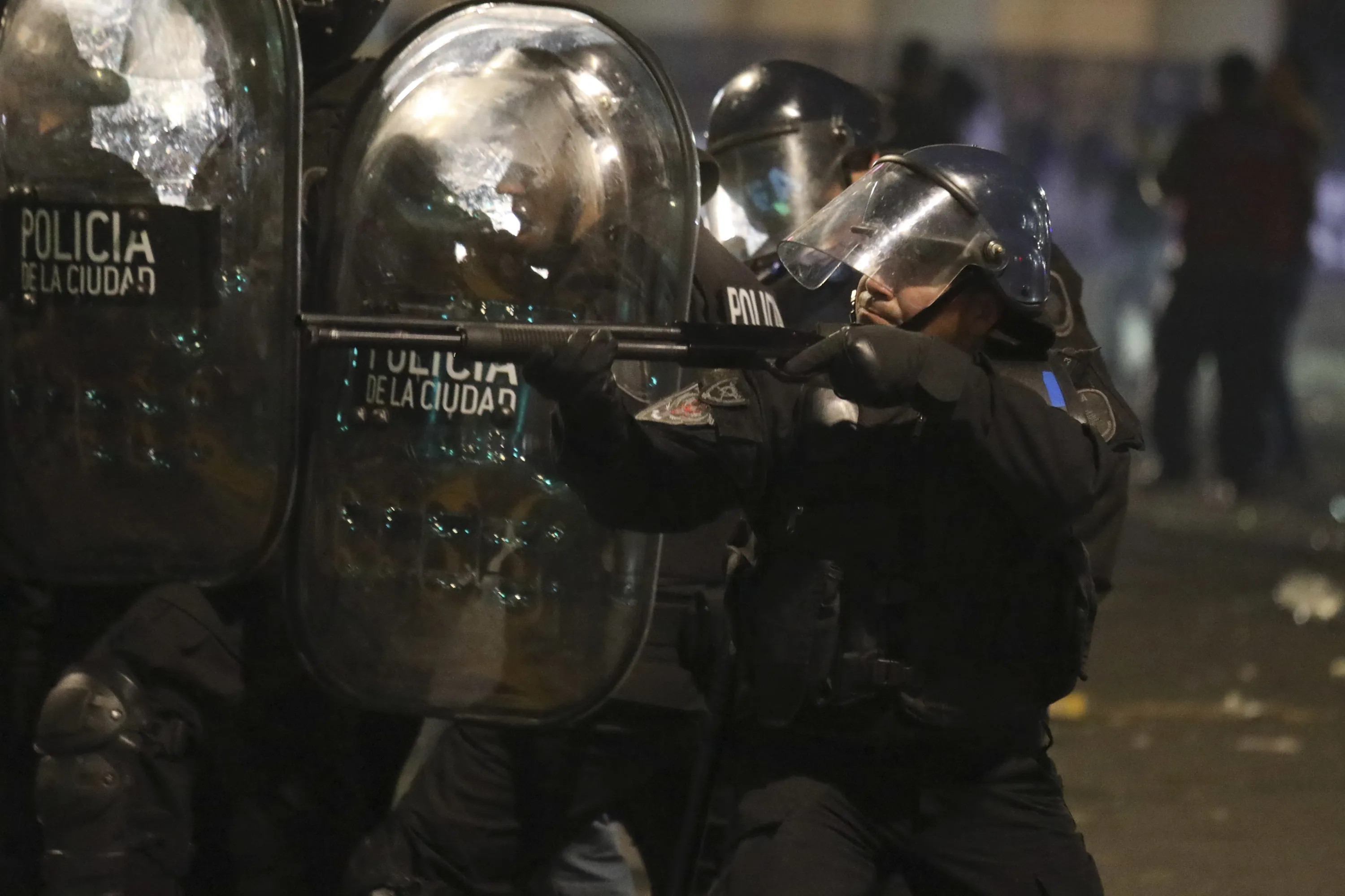 A police officer aims his shotgun at demonstrators during clashes after a protest for missing activist Santiago Maldonado, in Buenos Aires, Argentina, Friday, September 1, 2017. Human rights groups say Maldonado went missing a month ago today, after Argentine border police captured him during an operation against Mapuche Indians who were blocking a highway in Argentina's Patagonia. (Photo by Joaquin Salguero/AP Photo)