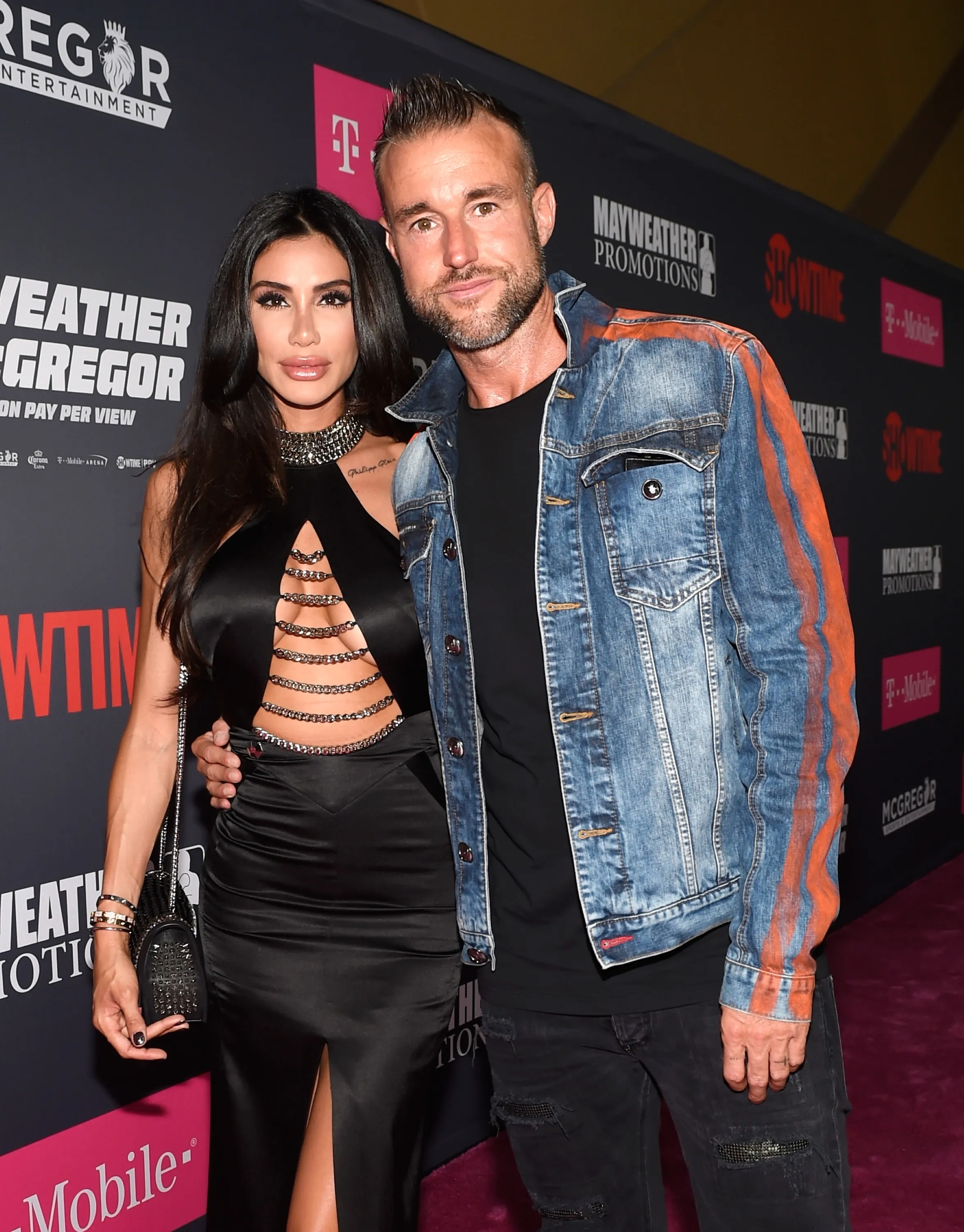 Morgan Osman (L) and fashion designer Philipp Plein arrive on T-Mobile's magenta carpet duirng the Showtime, WME IME and Mayweather Promotions VIP Pre-Fight Party for Mayweather vs. McGregor at T-Mobile Arena on August 26, 2017 in Las Vegas, Nevada. (Photo by David Becker/Getty Images for Showtime)