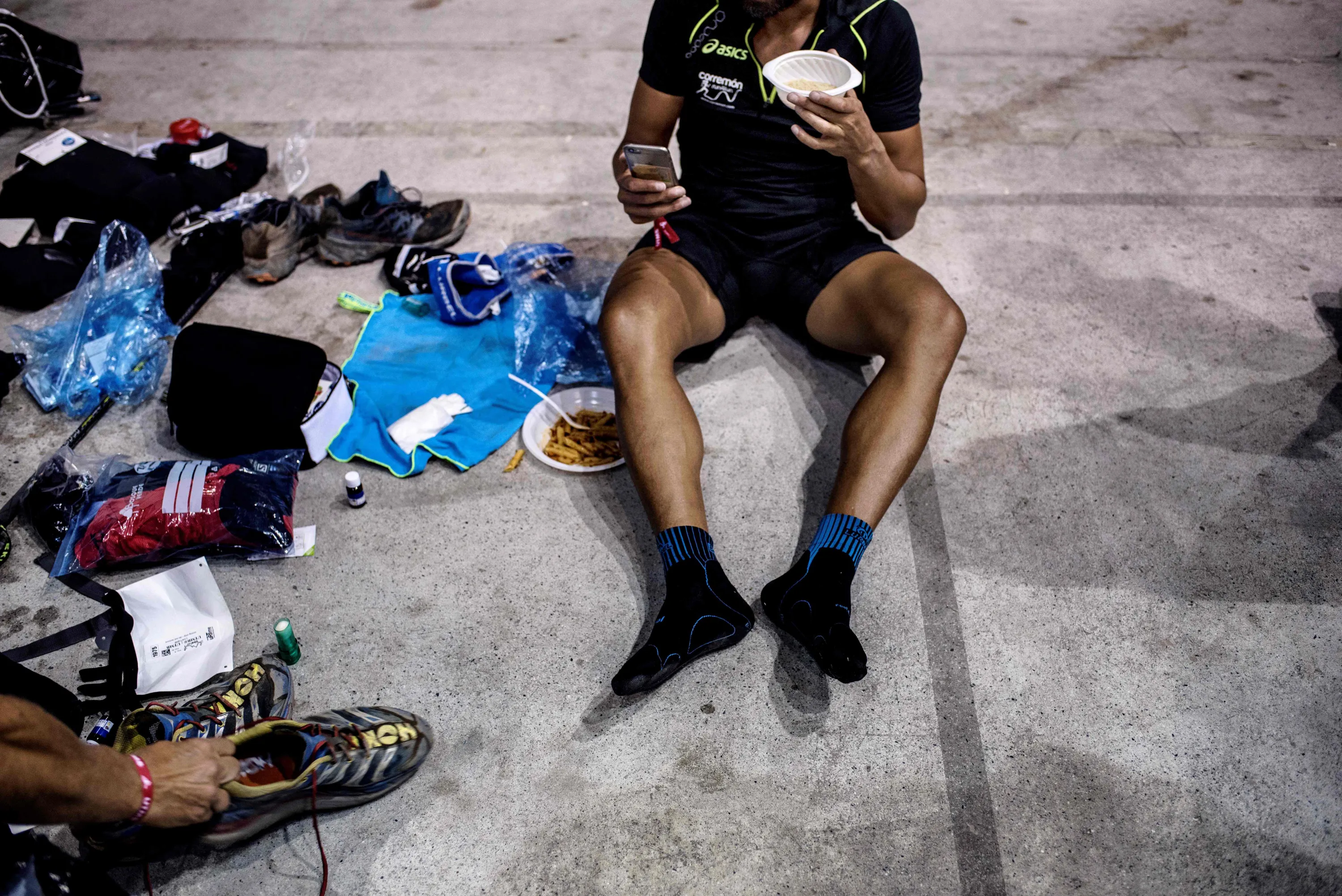 An Ultra- trailer eats and rests at a refreshment post on September 2, 2017 in Courmayeur, Italy, during the 15 th edition of the Mount Blanc Ultra Trail (UTMB), a 170 km race around the Mont Blanc crossing France, Italy and Switzerland. (Photo by Jeff Pachoud/AFP Photo)