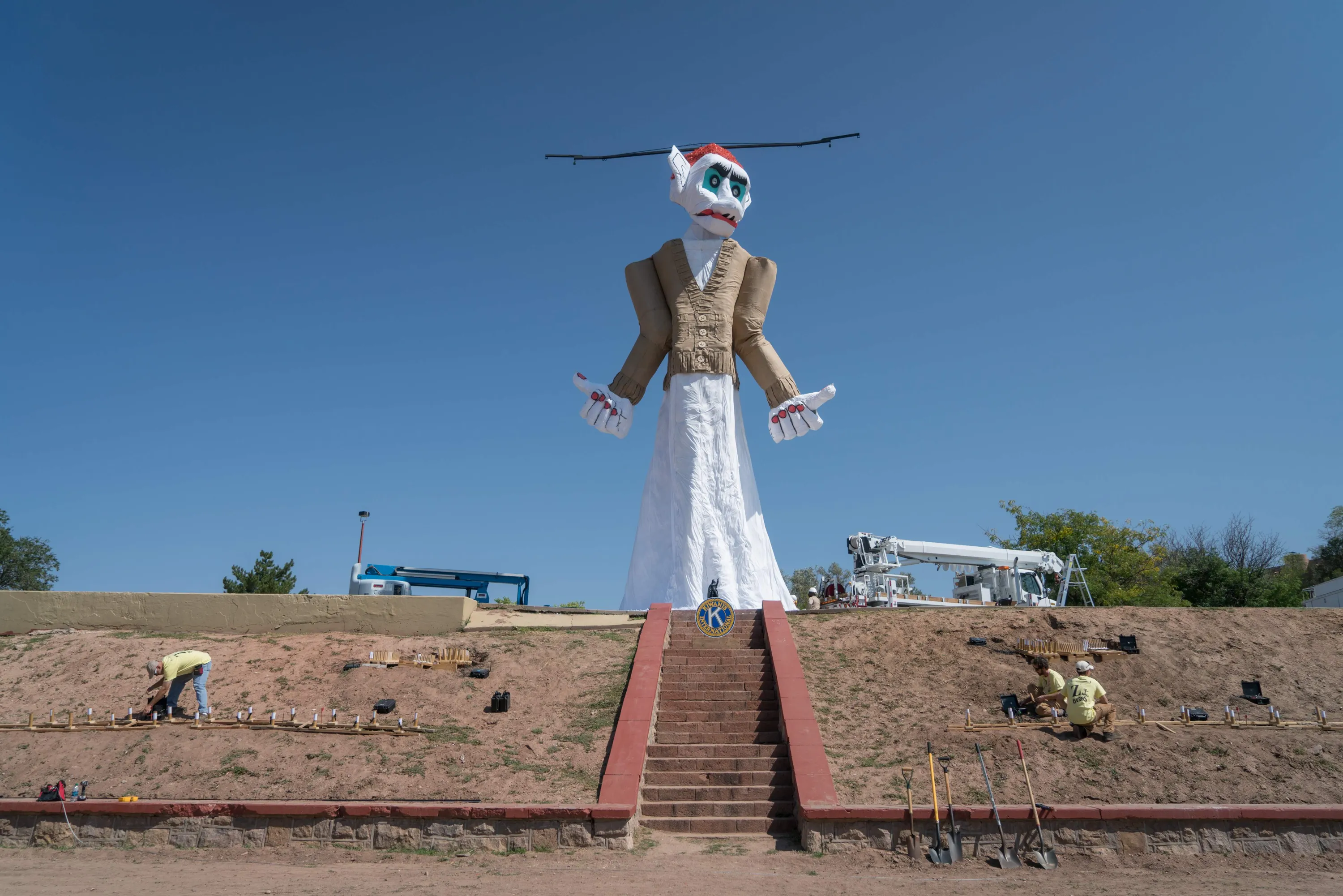 The marionette of Zozobra is pictured at Fort Marcy Park, as pyrotechnics work on rigging fireworks where it will be burned before a crowd of more than 50,000 in Santa Fe, New Mexico on September 1, 2017. Every year the Santa Fe Kiwanis club constructs the 50- foot (15- Meter) marionette to burn away all the gloom and despair of the residents of Santa Fe. (Photo by Paul Ratje/AFP Photo)