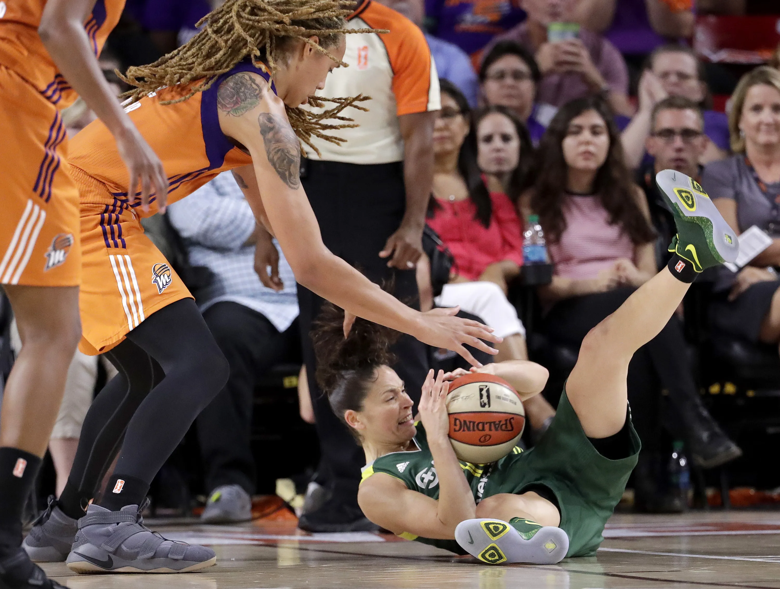 Seattle Storm guard Sue Bird (10) and Phoenix Mercury center Brittney Griner vie for the ball during the second half of a single-game WNBA basketball playoff matchup, Wednesday, September 6, 2017, in Tempe, Ariz. Phoenix won 79-69. (Photo by Matt York/AP Photo)