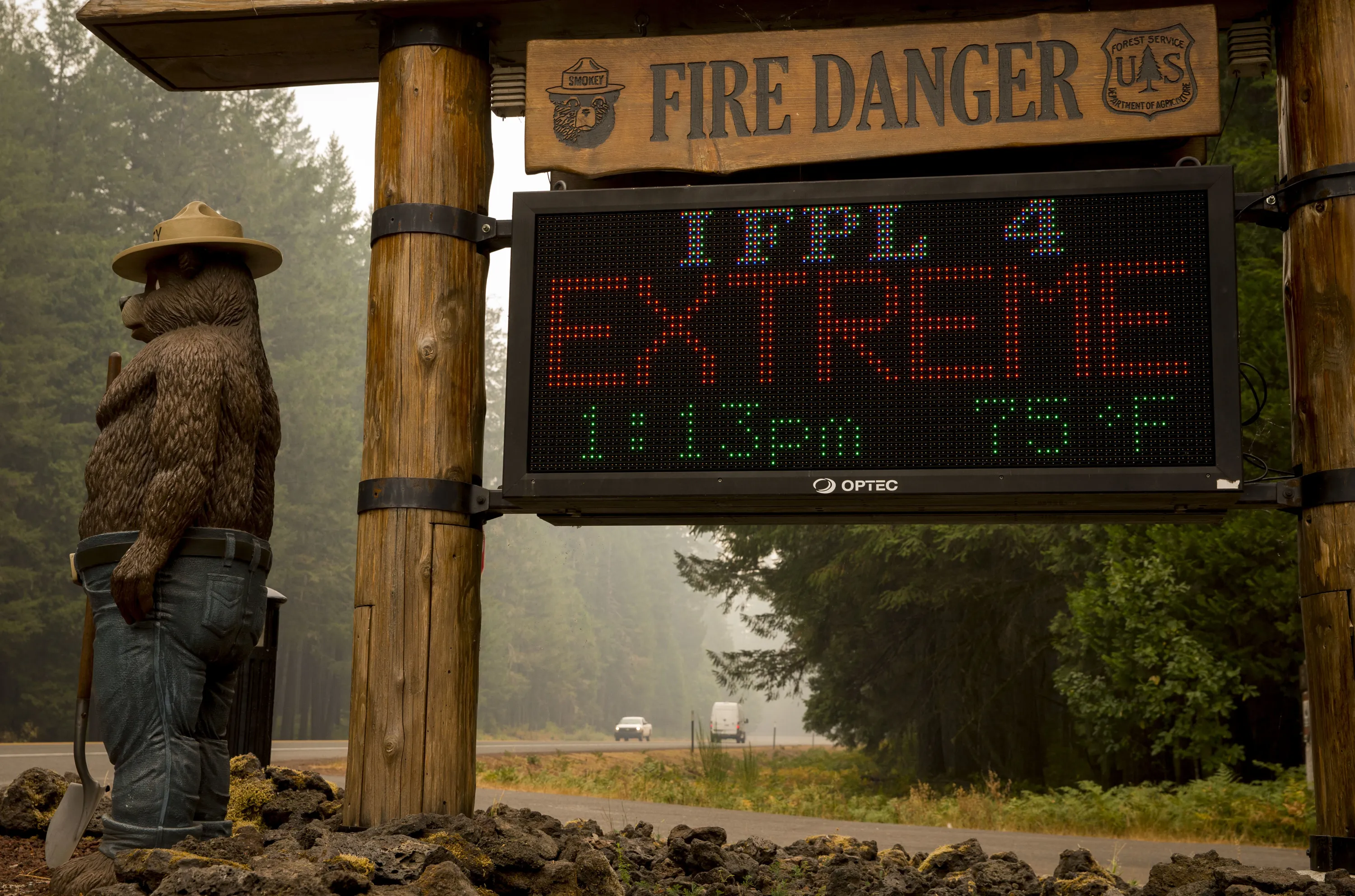A sign board at the McKenzie River Ranger Station makes clear the fire danger level in the Willamette National Forest, Wednesday, September 6, 2017 in Blue River, Ore. Several fires are burning in the area. (Photo by Andy Nelson/The Register-Guard via AP Photo)