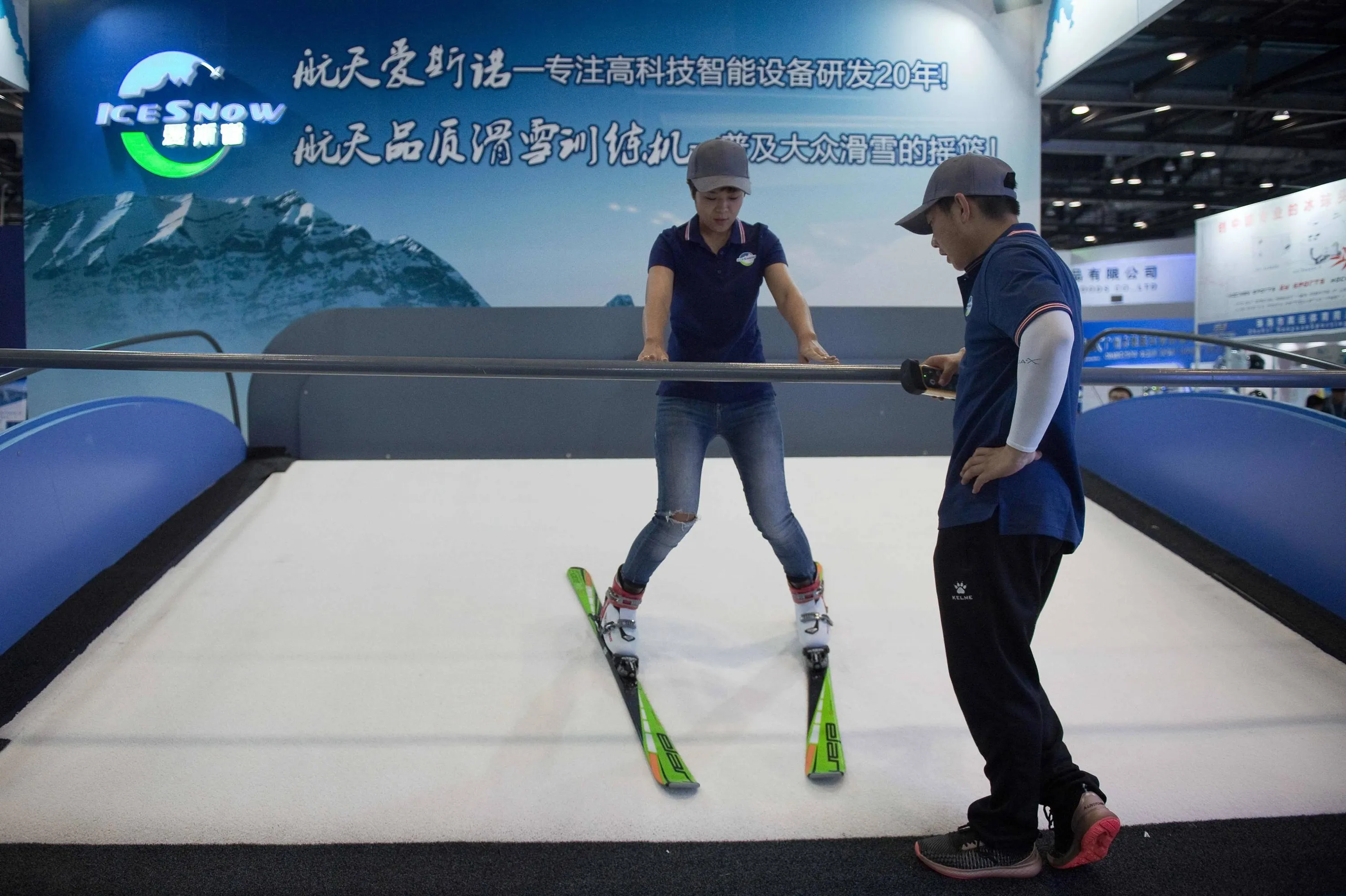 A woman gets a ski lesson on a mechanical ski slope at the China National Convention Centre during the World Winter Sports Expo in Beijing on September 7, 2017. (Photo by Nicolas Asfouri/AFP Photo)