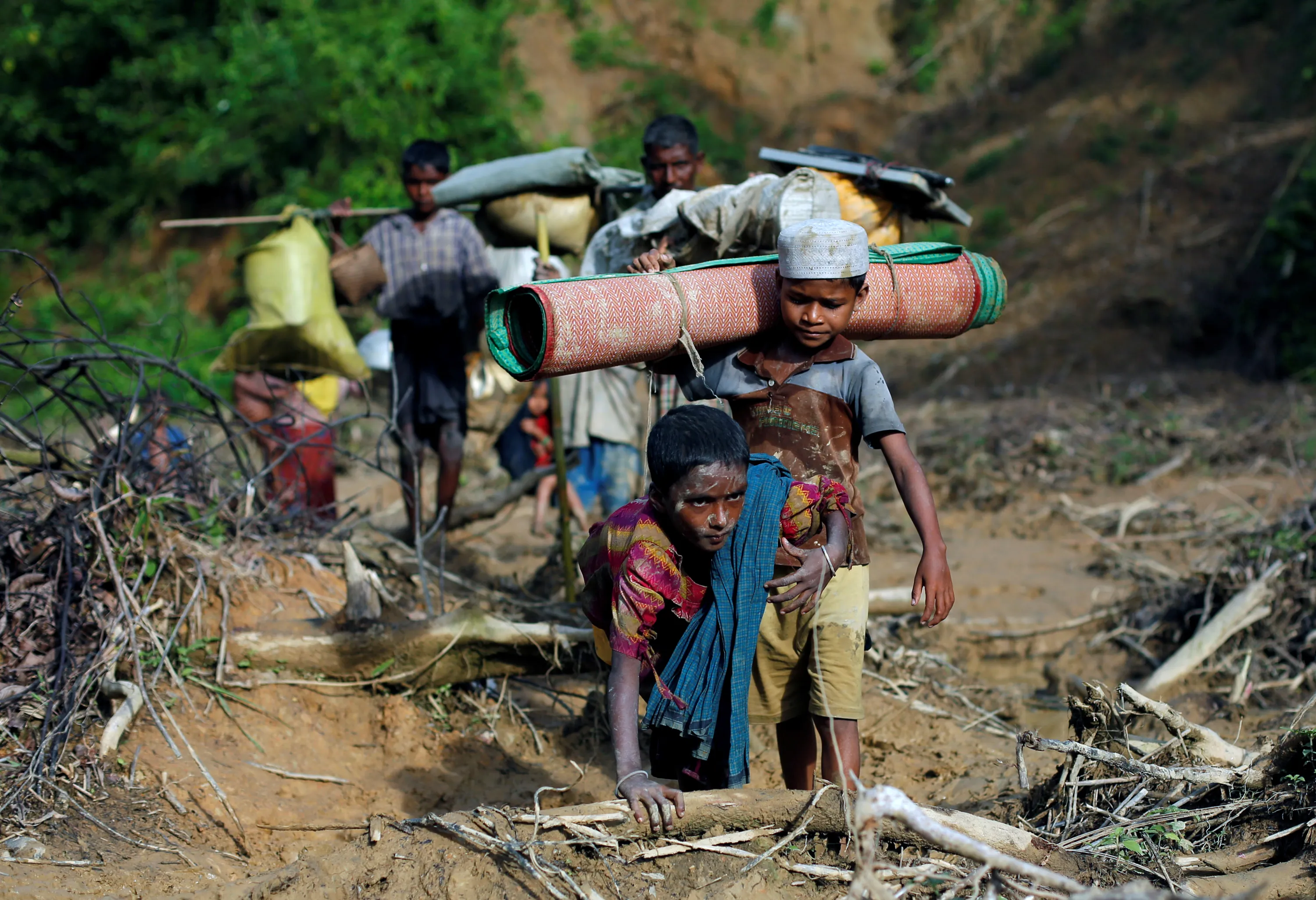 Rohingya refugees walk on a muddy path after crossing the Bangladesh-Myanmar border in Cox's Bazar, Bangladesh September 8, 2017. (Photo by Danish Siddiqui/Reuters)
