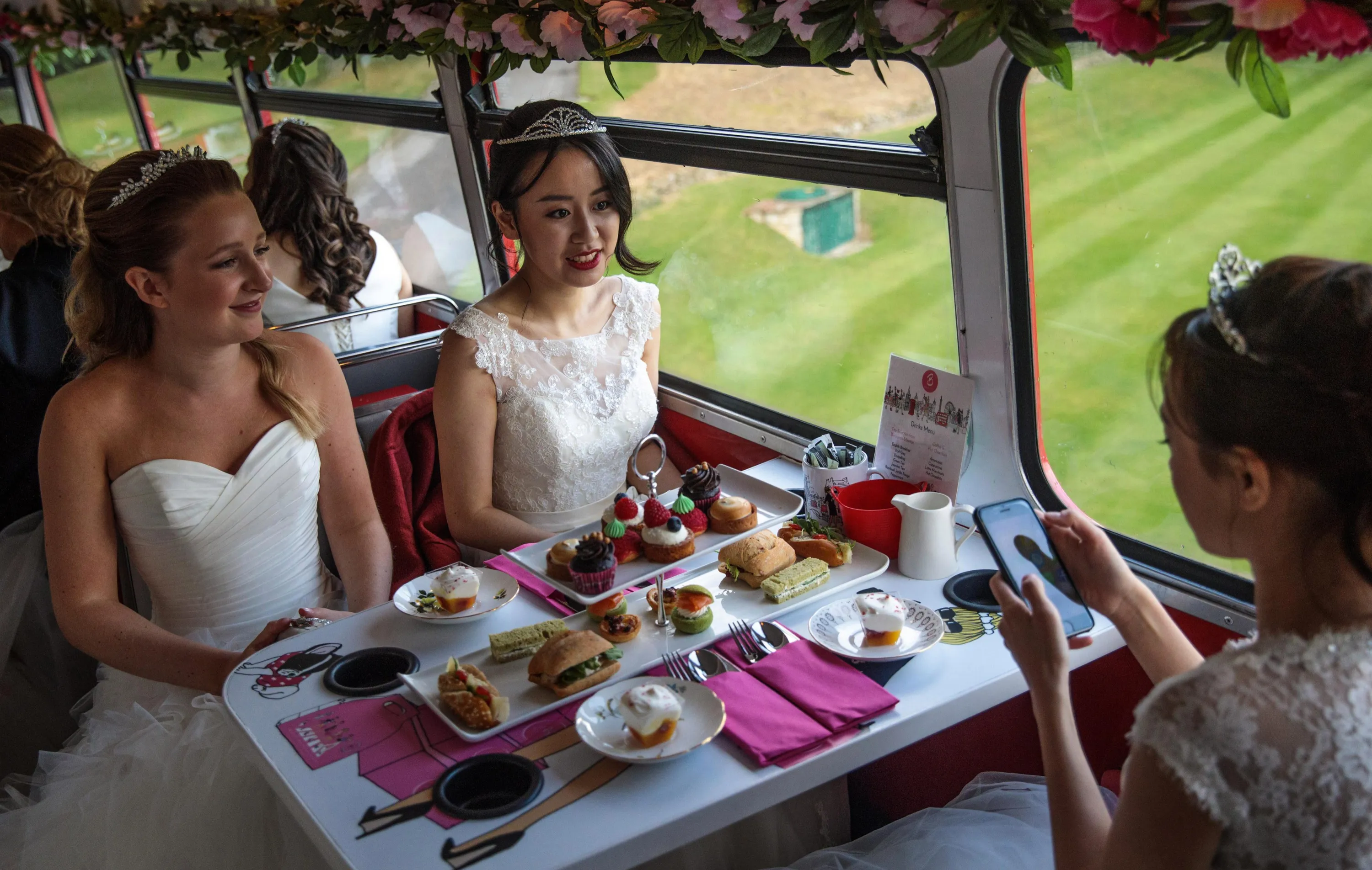 Debutantes sit at tables laid with cakes and sandwiches on the top deck of a Routemaster bus before leaving Boughton Monchelsea Place for the Queen Charlotte's Ball on September 9, 2017 in Maidstone, England. (Photo by Jack Taylor/Getty Images)