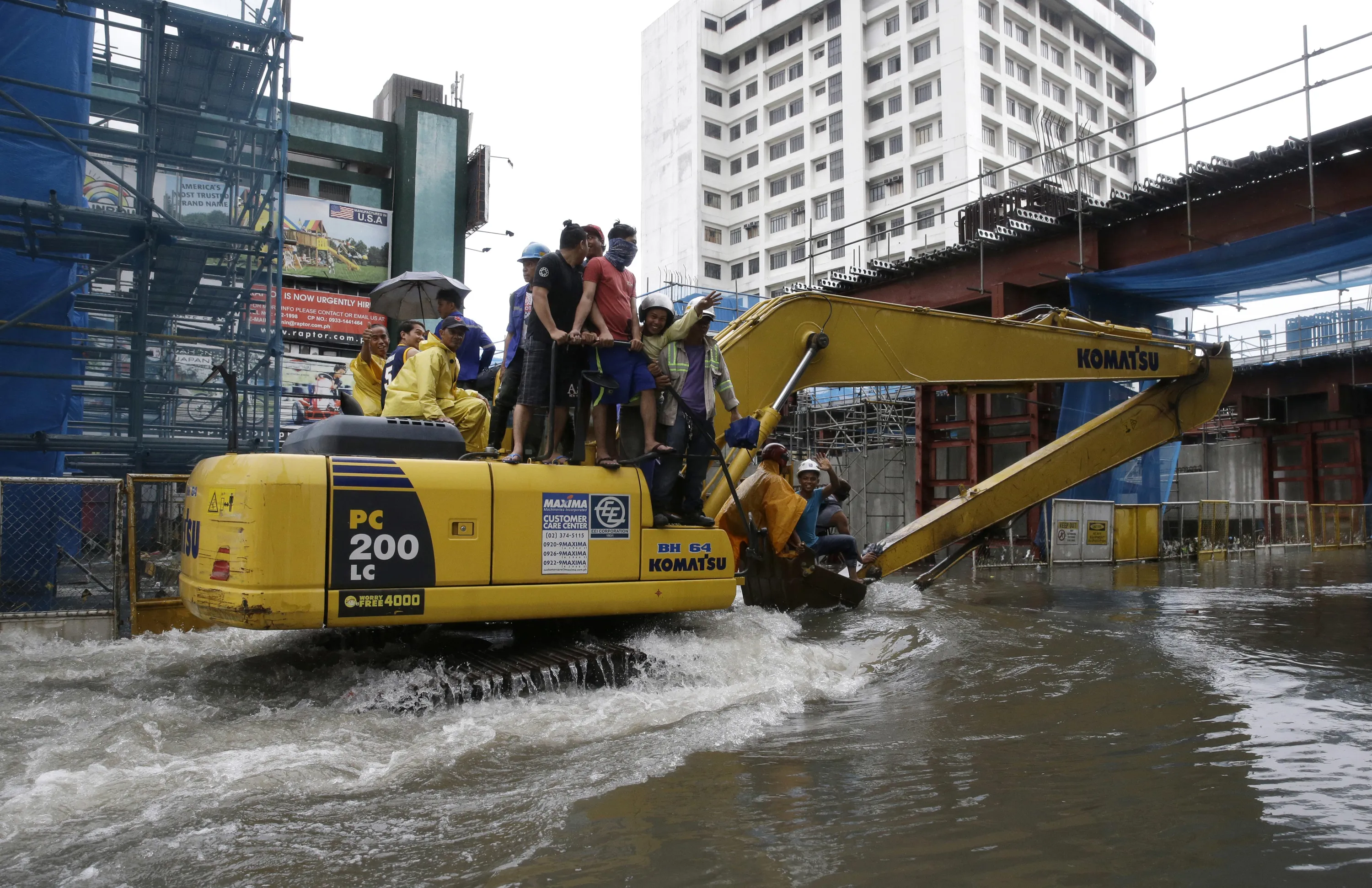 Filipino workers ride on a backhoe as they cross a flooded street in Manila, Philippines on Tuesday, September 12, 2017. (Photo by Aaron Favila/AP Photo)