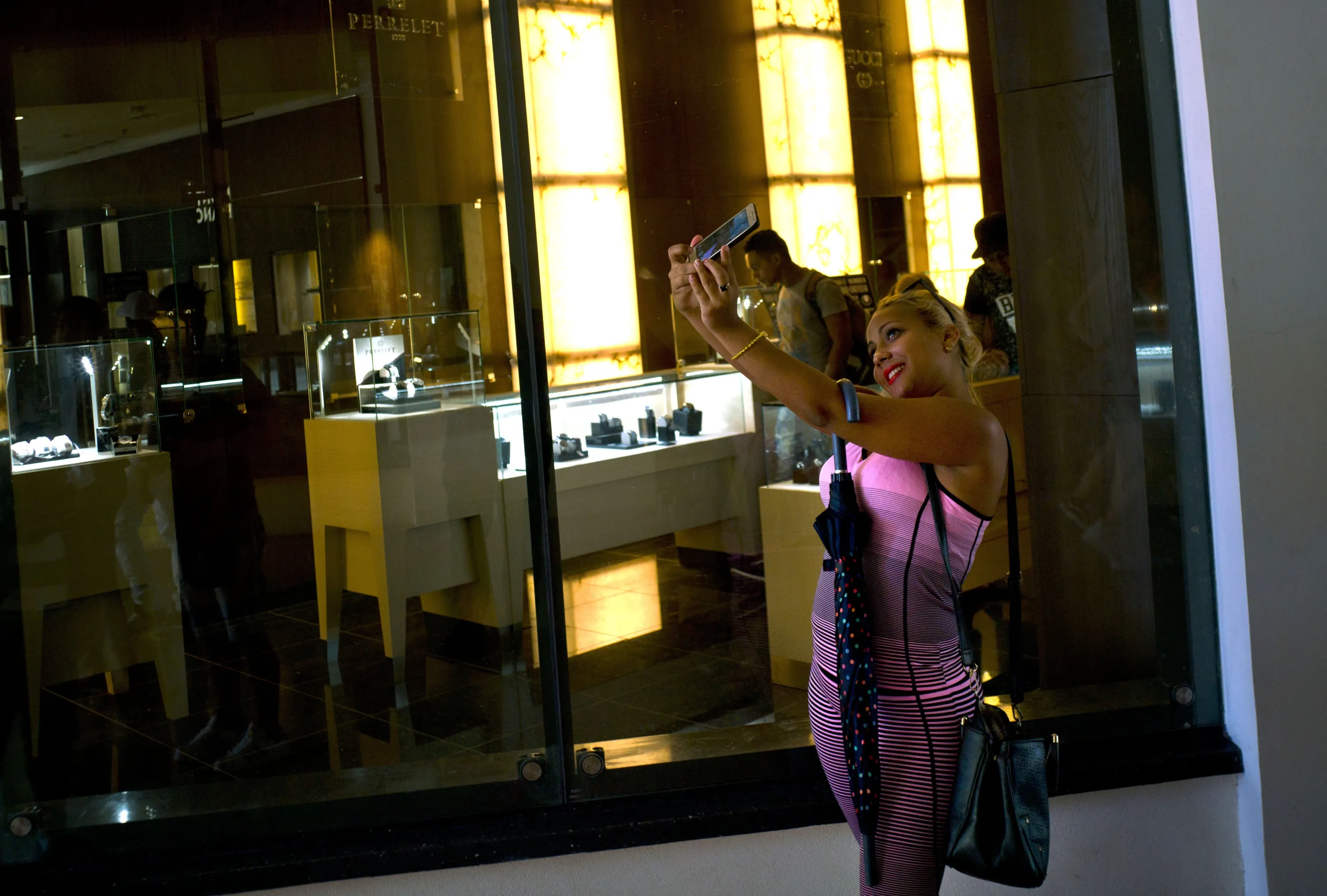 A Cuban girl takes a selfie in front of a window of a luxury store at the Manzana de Gomez Kempinski five-star hotel in Havana, Cuba, Monday, May 8, 2017. With other sectors declining, Cuba’s increasingly important tourism industry is under pressure to change its state-run hotels’ reputation for charging exorbitant prices for rooms and food far below international standards. The Manzana de Gomez Kempinski bills itself as Cuba’s first real five-star hotel, and the brand-name shops around it appear designed to reinforce that. (Photo by Ramon Espinosa/AP Photo)