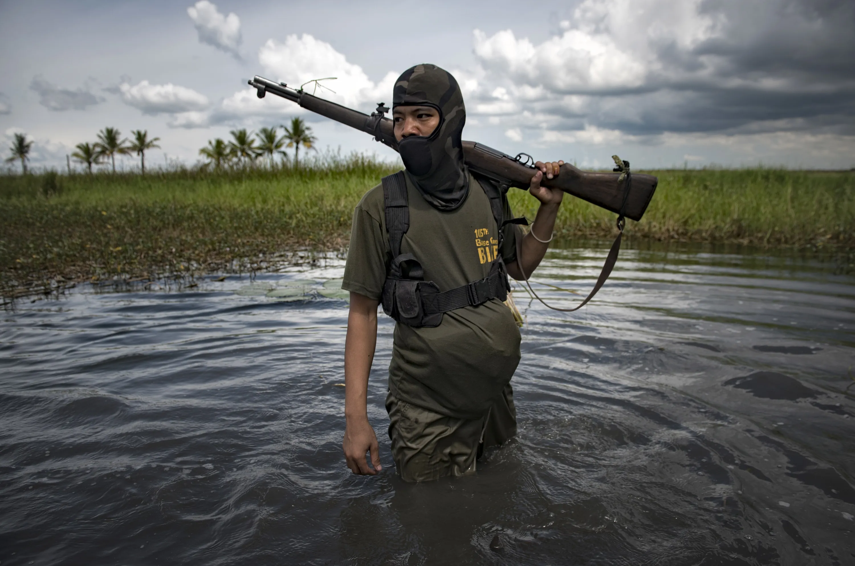 A Moro Islamic Liberation Front Fighter walks through a marshland going at the frontline of battle against extremists on August 22, 2017 in Maguindanao Province, Philippines. Philippines' largest Muslim militant group, the Moro Islamic Liberation Front (MILF) started an offensive attack against Muslim extremists who have pledged allegiance to the Islamic State, Bangsamoro Islamic Freedom Fighters (BIFF) more then 2 weeks ago in Maguindanao as an effort to stop IS influence from spreading in the volatile island of Mindanao.The MILF militant group recently forged a peace agreement with the Philippines government while pushing for an autonomous state in Mindanao and warned that a failed attempt could lead to more of its people towards extremism. 'Massive corruption and extreme poverty is still the reason why people join these extremist groups who has money. But we, as Muslims do not believe in what they are doing. ' says MILF fighter Moreed Mamalangkay. Over 24,000 people have fled their homes in Maguindanao according to recent reports while the battle between ISIS linked militants and government forces in the southern Muslim city of Marawi enters its fourth month, displacing thousands of civilians and killing over 700 people. (Photo by Jes Aznar/Getty Images)