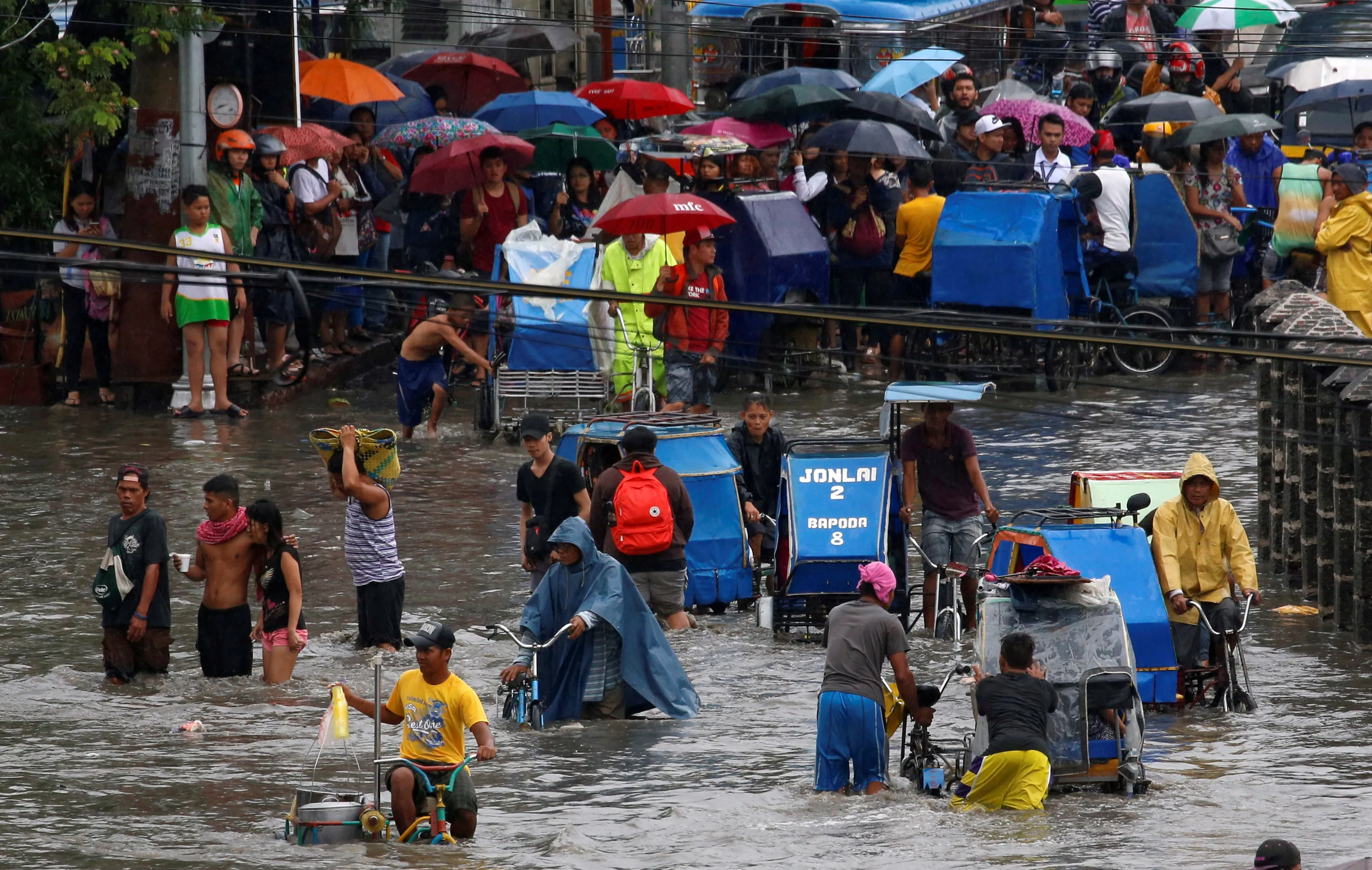 Residents wait their turn to make their way through floodwaters on pedicabs in Las Pinas, Metro Manila as a storm sweeps across the main Luzon island, Philippines, September 12, 2017. (Photo by Erik De Castro/Reuters)
