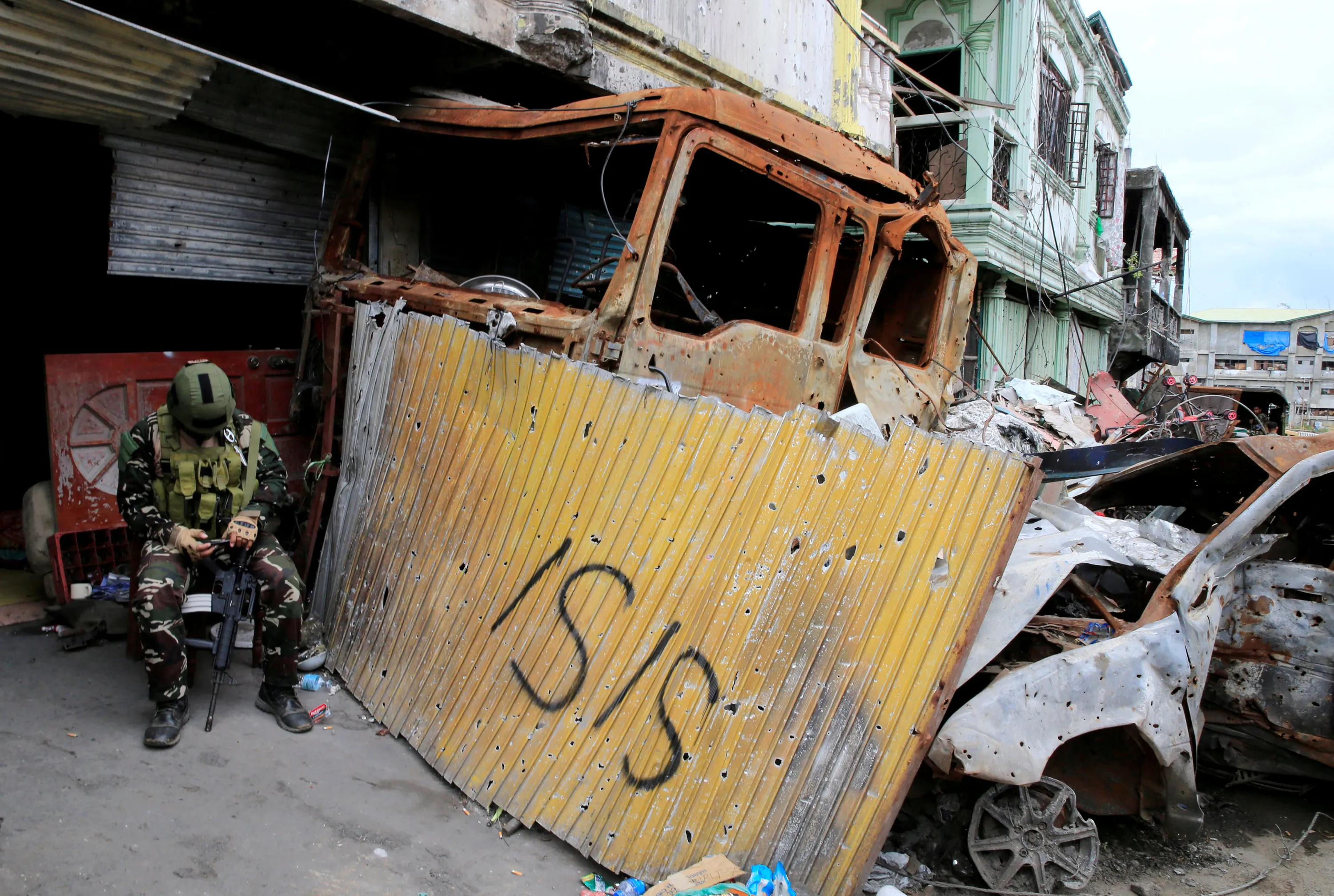 A government soldier checks his mobile phone in front of damaged houses and buildings as troops continue their assault on clearing operations against the pro-IS militant group which seized Mapandi district in Marawi city, southern Philippines, September 13, 2017. (Photo by Romeo Ranoco/Reuters)