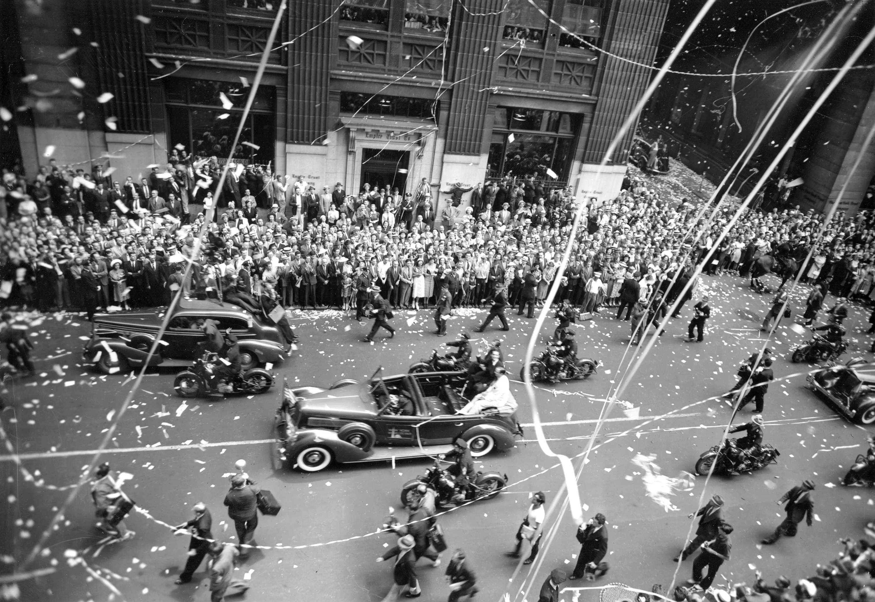 Howard Hughes waves to the crowd from the back seat of an open car, center, during a welcome parade for the aviator along Broadway in lower Manhattan, July 15, 1938. Hughes and his crew arrived yesterday after completing a flight around the world in less than four days. (Photo by AP Photo)