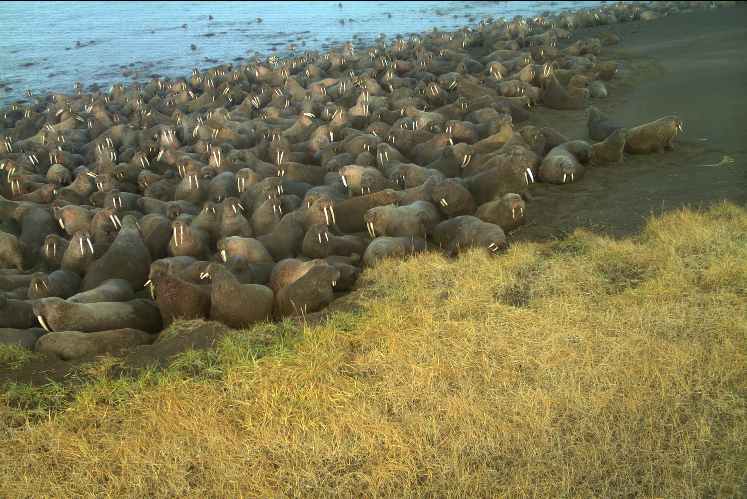 In this September 7, 2015, photo from an unmanned remote camera and provided by U.S. Fish and Wildlife walruses lay on the beach at Point Lay, Alaska. The U.S. Fish and Wildlife Service says 64 walruses died on the northwest Alaska beach and the animals may have been killed in stampedes. (Photo by U.S. Fish and Wildlife via AP Photo)