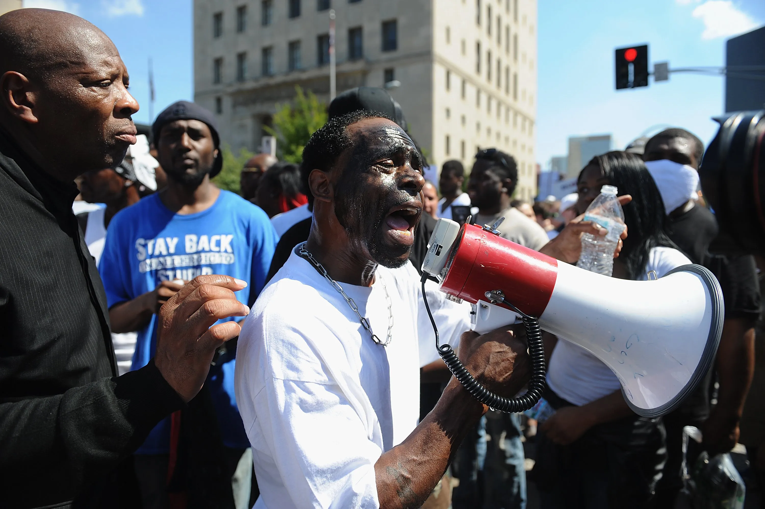 Protestors march through the city streets following a not guilty verdict on September 15, 2017 in St. Louis, Missouri. Protests erupted today following the acquittal of former St. Louis police officer Jason Stockley, who was charged with first-degree murder last year in the shooting death of motorist Anthony Lamar Smith in 2011. (Photo by Michael B. Thomas/Getty Images)