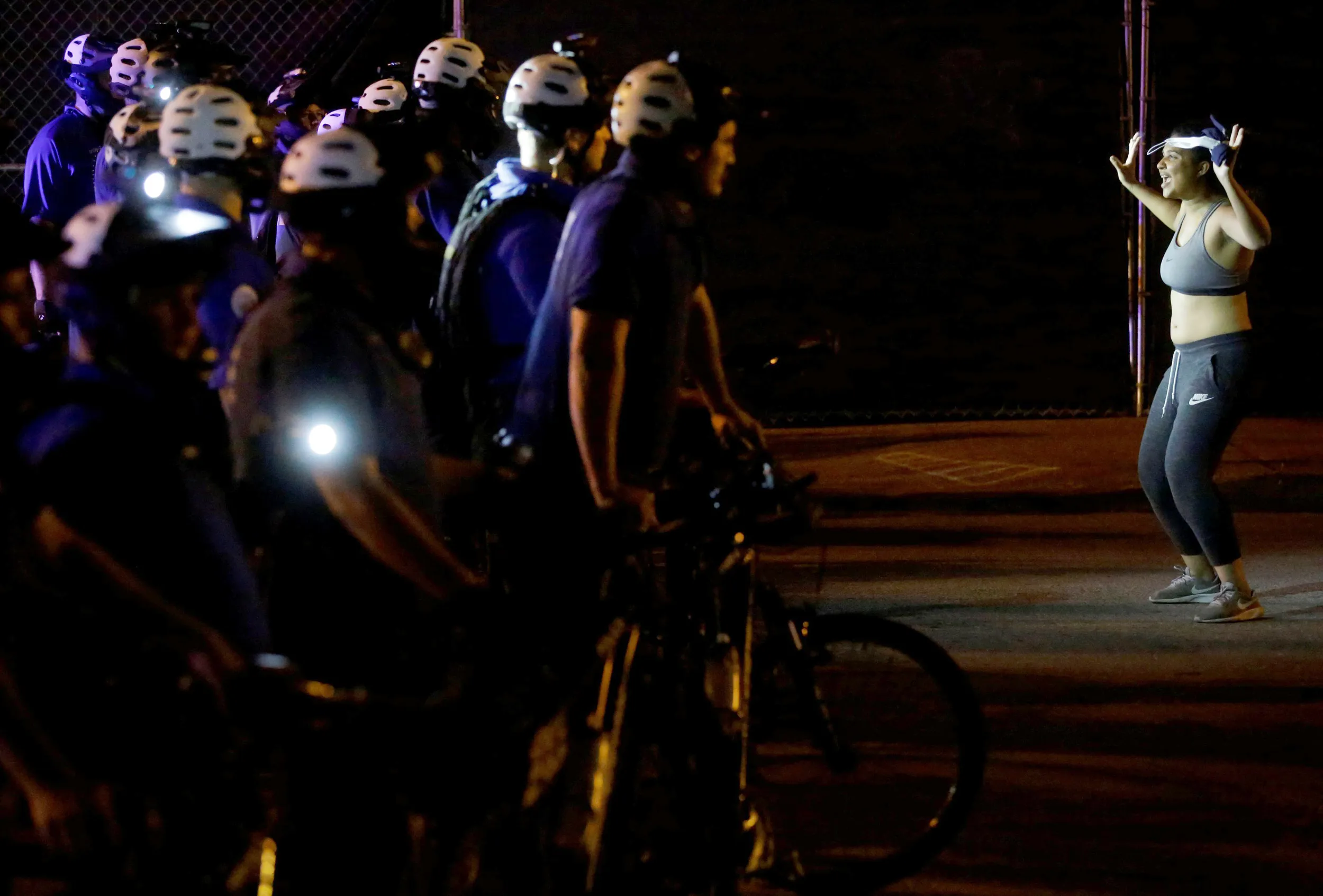 Police officers watch a demonstrator as she confronts them during a protest for the not guilty verdict in the murder trial of Jason Stockley, a former St. Louis police officer, charged with the 2011 shooting of Anthony Lamar Smith, who was black, in St. Louis, Missouri, U.S., September 17, 2017. (Photo by Joshua Lott/Reuters)