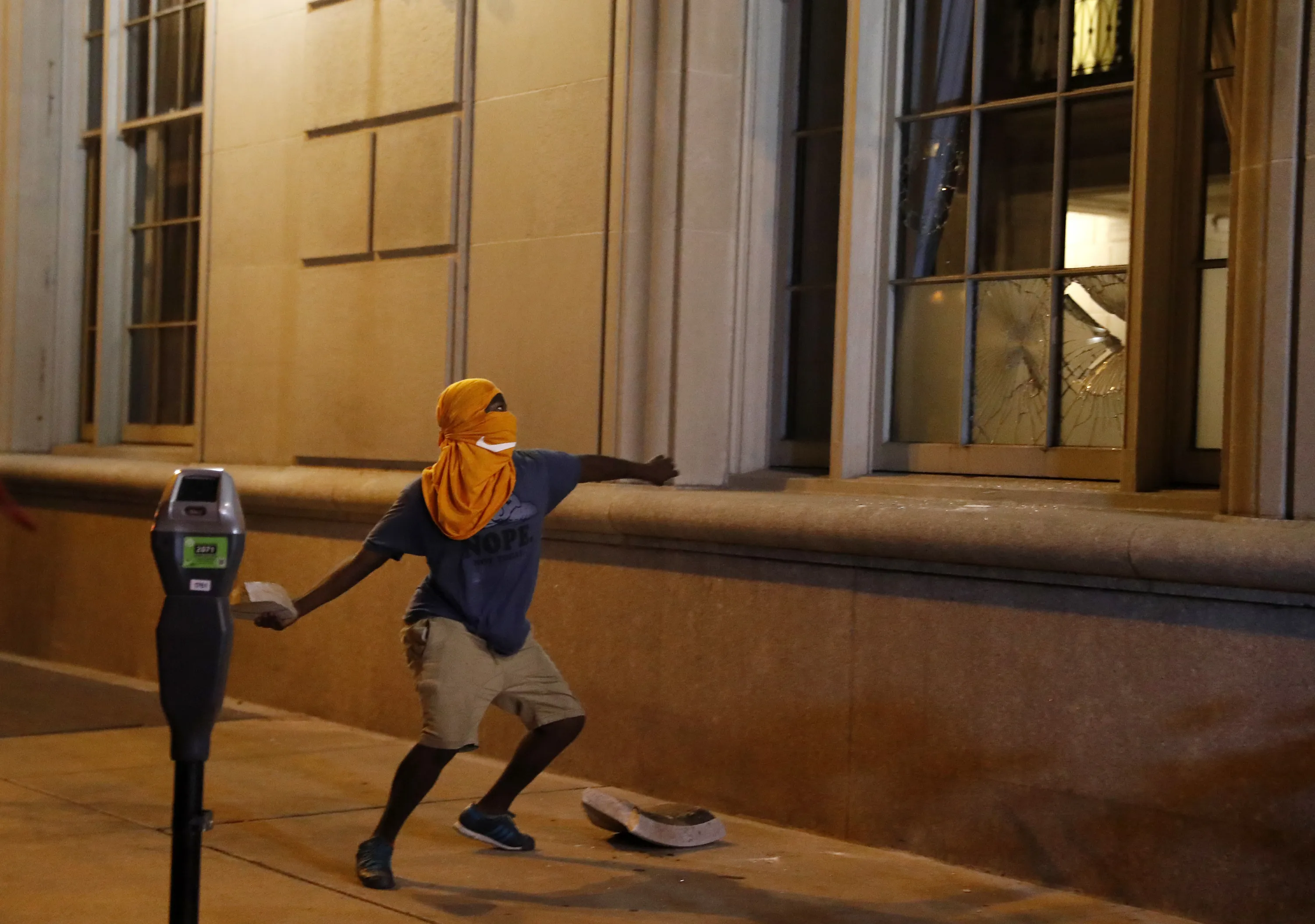 A man throws a rock into the window as demonstrators march in response to a not guilty verdict in the trial of former St. Louis police officer Jason Stockley, Sunday, September 17, 2017, in St. Louis. Stockley was acquitted in the 2011 killing of a black man following a high-speed chase. (Photo by Jeff Roberson/AP Photo)
