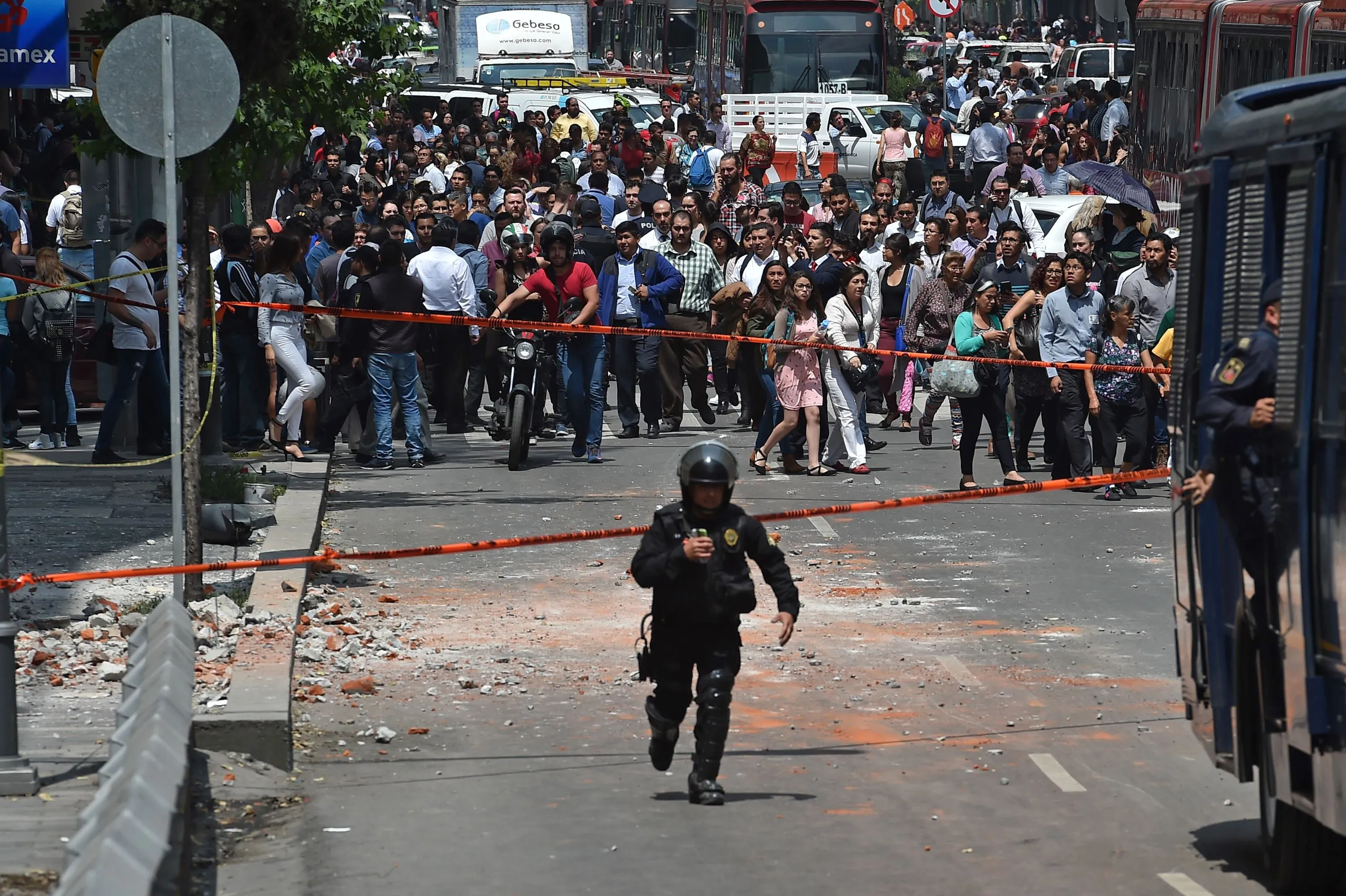 Mexican policemen run towards the site where a building collapsed after a powerful quake in Mexico City on September 19, 2017. (Photo by Yuri Cortez/AFP Photo)