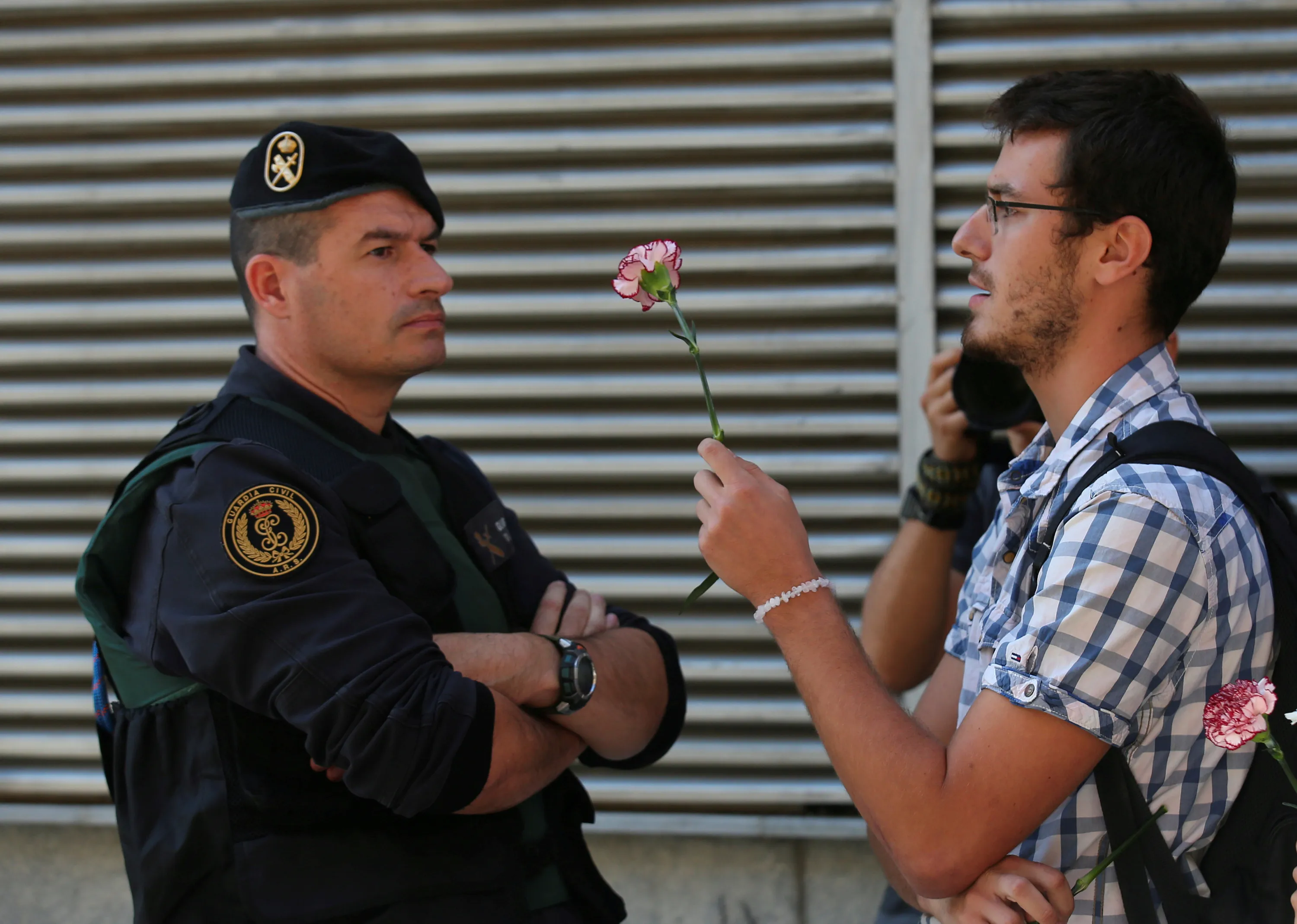 A man holds up a carnation next to a Spanish civil guard during a raid on a Unipost office in search of material for the proposed October 1 referendum, in Terrassa, Spain, September 19, 2017. (Photo by Albert Gea/Reuters)